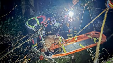 Trotz einer Bremsung konnte er den Zusammenprall mit einem der Tiere nicht verhindern, während das zweite Tier weiter in das angrenzende Feld sprang.