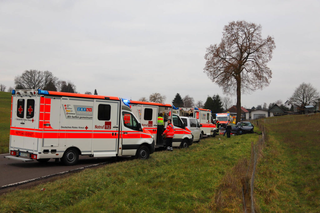Rettungsdienst mit Hubschrauber, Feuerwehr, Polizei und Abschleppdienste waren im Einsatz. Ersten Ermittlungen zufolge waren zwei Pkw frontal kollidiert und auch ein drittes, nachfolgendes, Auto konnte dem Zusammenstoß nicht mehr ausweichen.