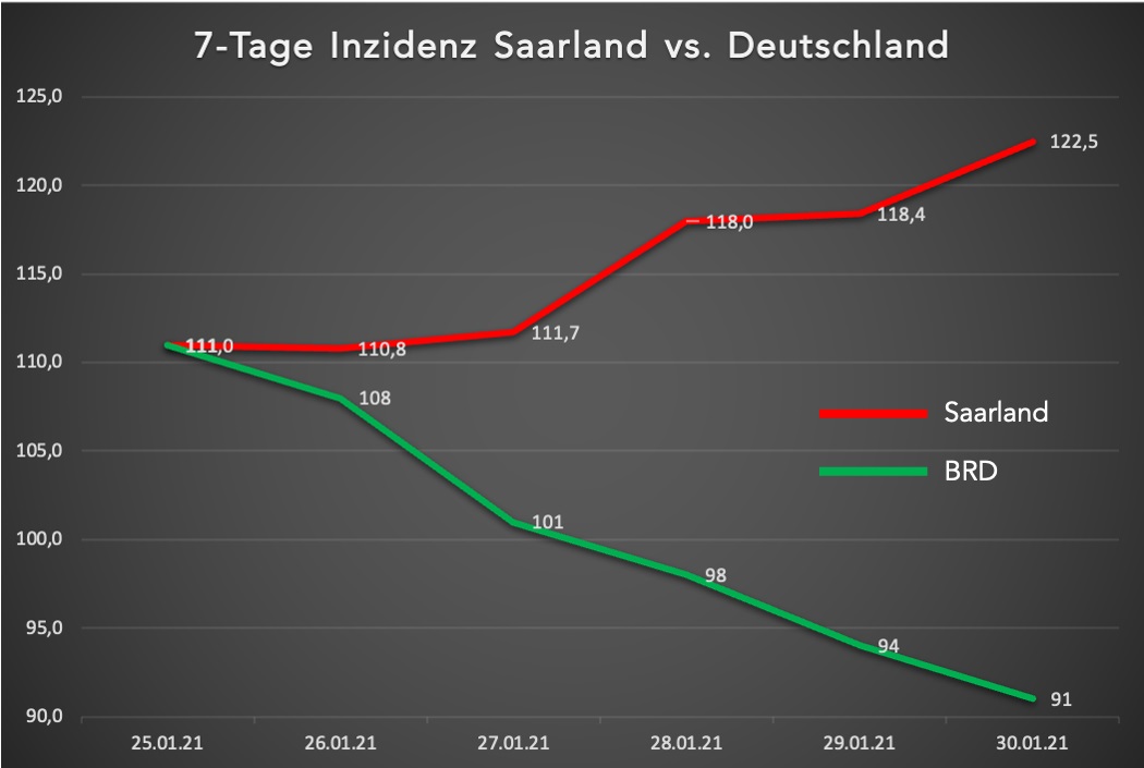 Dabei hat es bis Mitte Januar noch gut ausgesehen: Unsere Zahlen sanken und das Saarland konnte mit die besten Inzidenzen vorweisen. Am 25.01. lagen dann Saarland und Deutschland erstmals mit einer Inzidenz von 111 wieder gleichauf.