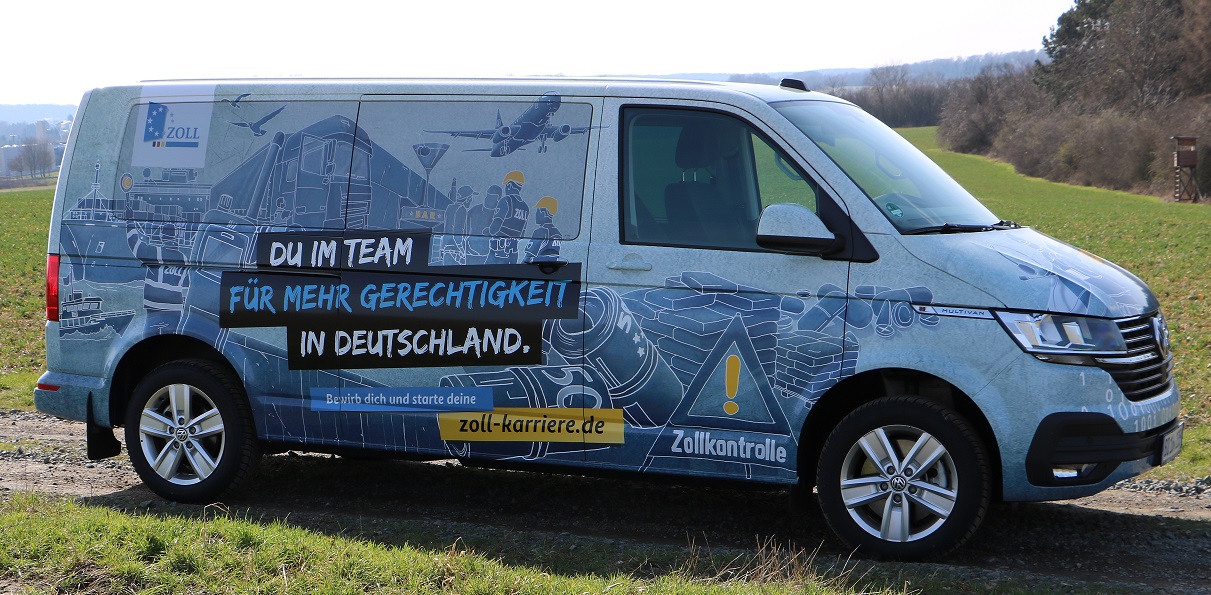Seit Neuestem wirbt der Zoll auch mit einem eigens beklebten Van um Nachwuchs. Die auffällige Gestaltung soll insbesondere junge Menschen ansprechen, die sich für den Zoll und seine Aufgaben interessieren und sich deshalb für eine Ausbildung oder ein duales Studium beim Zoll bewerben möchten. Sobald die Pandemie dies wieder zulässt, wird der Werbe-Bus bei Veranstaltungen und Ausbildungsmessen eingesetzt.
