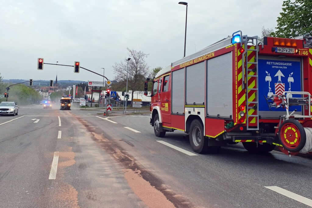 Gerade vom Kaminbrand in Münchwies wieder eingerückt, schickte die Integrierte Leitstelle die Feuerwehrleute aus der Neunkircher Innenstadt um 18:30 Uhr direkt weiter zum nächsten Einsatz. Eine längere Ölspur zog sich von der Kreuzung der Königsbahn- und Irrgartenstraße mit der Westspange über die Königsstraße bis zur Ritzwiesstraße. In Amtshilfe forderte die Polizei die Feuerwehr an, um bei der Verkehrsabsicherung auf dem vielbefahrenen Straßenabschnitt zu helfen. Abgesichert durch Kräfte der Polizei und der Feuerwehr konnte der Zentrale Betriebshof Neunkirchen die Ölspur mit einer Spezialkehrmaschine aufnehmen und die Fahrbahn reinigen.
