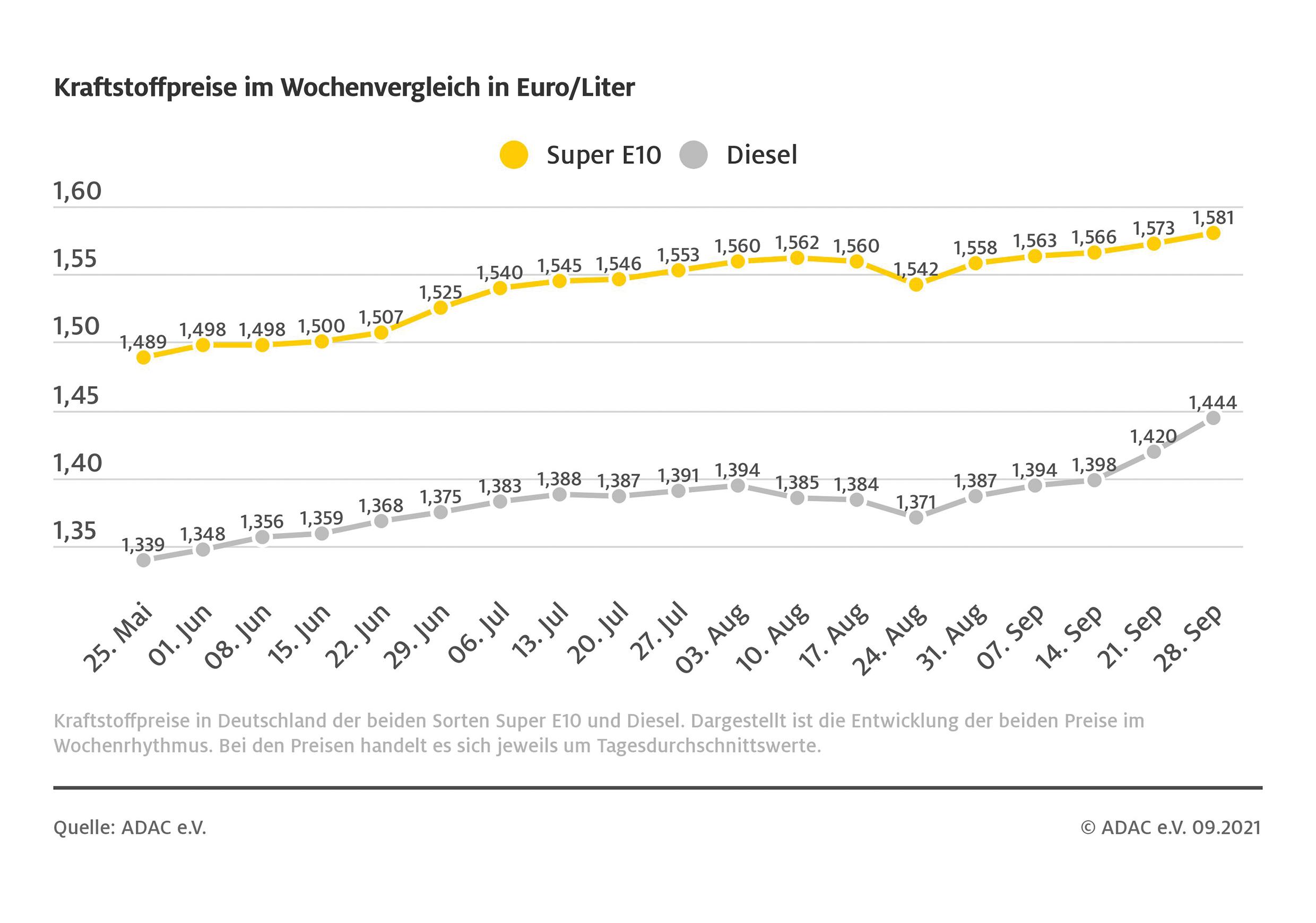 Die im Herbst stärker werdende Heizölnachfrage sorgt an den Tankstellen in Deutschland für deutlich höhere Dieselpreise. Wie die aktuelle ADAC Auswertung der Kraftstoffpreise zeigt, kletterte der Preis für einen Liter Diesel binnen Wochenfrist um 2,4 Cent und liegt derzeit im bundesweiten Mittel bei 1,444 Euro. Auch Benzin verteuerte sich gegenüber der Vorwoche: Ein Liter kostet im Schnitt 1,581 Euro – ein Plus von 0,8 Cent.