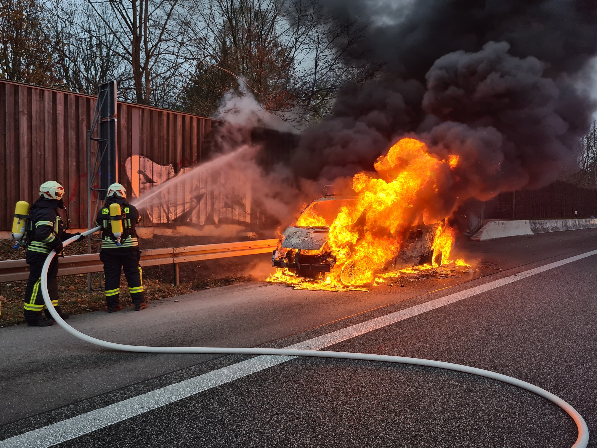 Mit Wasser dämmten sie den Brand ein. Die Flammen griffen auf die Holzverkleidung der Lärmschutzwand über. Ein Brand der Lärmschutzwand verhinderten die EInsatzkräfte mit einem gezielten Löschangriff. Abschließend brachten die Einsatzkräfte einen Schaumteppich auf das Fahrzeug auf, um den Brand zu ersticken.