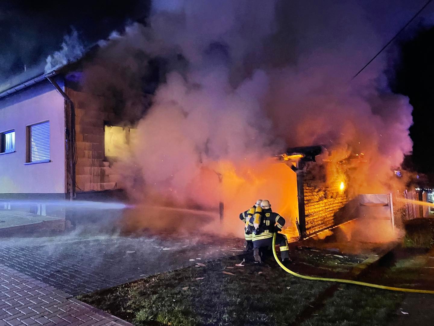 Das Feuer griff anschließend auf die angrenzende, rechte Fassade des Wohngebäudes über. Die insgesamt 70 Feuerwehrkräfte aus Lebach, Steinbach, Thalexweiler und Dörsdorf konnten das Brandgeschehen unter Kontrolle bringen, bevor das Wohngebäude weiter in Brand geriet.