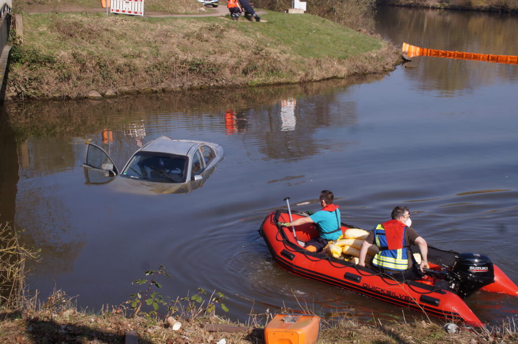 Die Szenen haben sich in Höhe der Kläranlage Saarlouis, an der Saar und Saaraltarm ineinander fließen, ereignet. Derzeit Taucher der Bereitschatfspolizei damit beschäftigt, das zerstörte Auto aus dem Wasser zu bergen. Die Feuerwehr hat Ölsperren aufgestellt, damit das aus dem Wrack auslaufende Öl nicht in die Saar fließt. Derzeit Taucher der Bereitschatfspolizei damit beschäftigt, das zerstörte Auto aus dem Wasser zu bergen. Die Feuerwehr hat Ölsperren aufgestellt, damit das aus dem Wrack auslaufende Öl nicht in die Saar fließt.