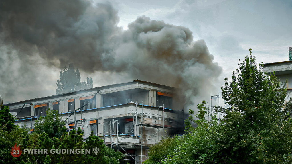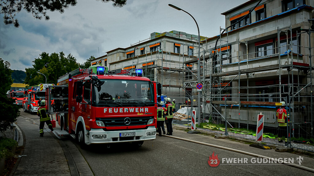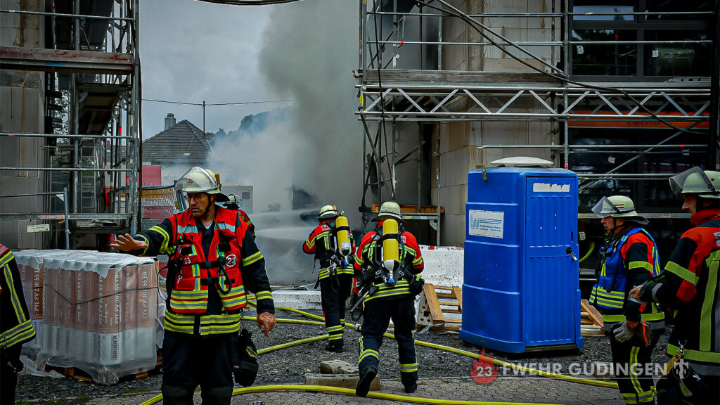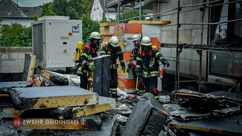 Vor Ort stellte sich heraus, dass Dämmstoffe und Baumaterialien an der Fassade eines im Bau befindlichen Wohnkomplexes in Flammen standen. Sofort wurden zwei C-Rohre durch zwei Trupps unter Atemschutz zur Brandbekämpfung eingesetzt. Ein weiterer Trupp verschaffte sich Zugang zum Rohbau, durchsuchte das Gebäude nach Personen und nahm ein weiteres Rohr vor. Die Wasserversorgung konnte schnell über einen Unterflurhydranten sichergestellt werden.