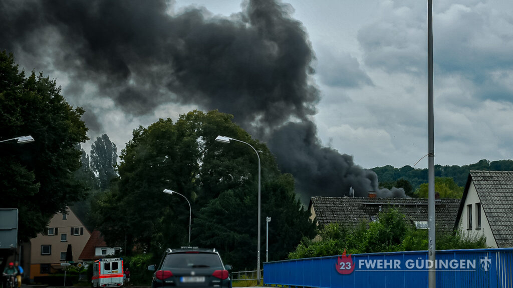 Güdingen – (Bildergalerie am Ende des Beitrags) Am Sonntag, den 18. August 2024, gegen 13:51 Uhr, wurde die Feuerwehr zu einem Brand im Industriegebiet „Kirchwies“ in Güdingen alarmiert. Mehrere Anrufer hatten eine starke schwarze Rauchsäule gemeldet, die bereits auf der Anfahrt von den Einsatzkräften bestätigt werden konnte.