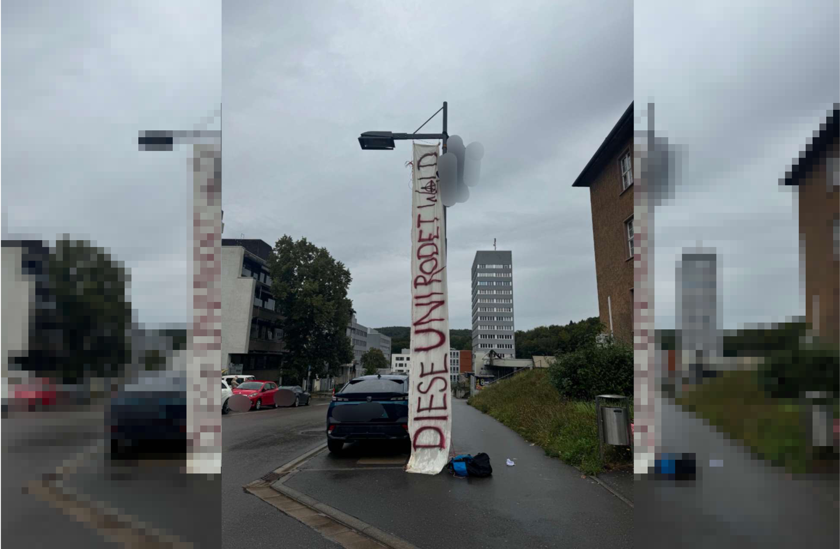Gegen 14:30 Uhr kletterte in unmittelbarer Nähe eine vermummte Person auf einen Laternenmast, befestigte sich daran und entfaltete ein Transparent mit der Aufschrift „Diese Uni rodet Wald“. Die nicht-binäre Person ignorierte die Ansprache der Polizei und stieg erst nach Beendigung der Versammlung freiwillig vom Mast herunter. Bei der anschließenden Identitätsfeststellung flüchtete er, konnte jedoch nach kurzer Verfolgung gefasst werden.