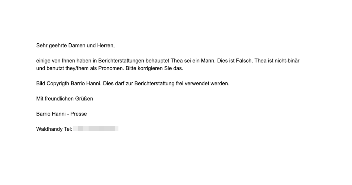 Vielmehr identifiziert sich „Thea“, so der Name des Aktivisten, als nicht-binär und verwendet die Pronomen they/them. Anbetracht dieser Tatsachen, bleibt uns nichts anderes übrig, als diese Korrektur zu akzeptieren…