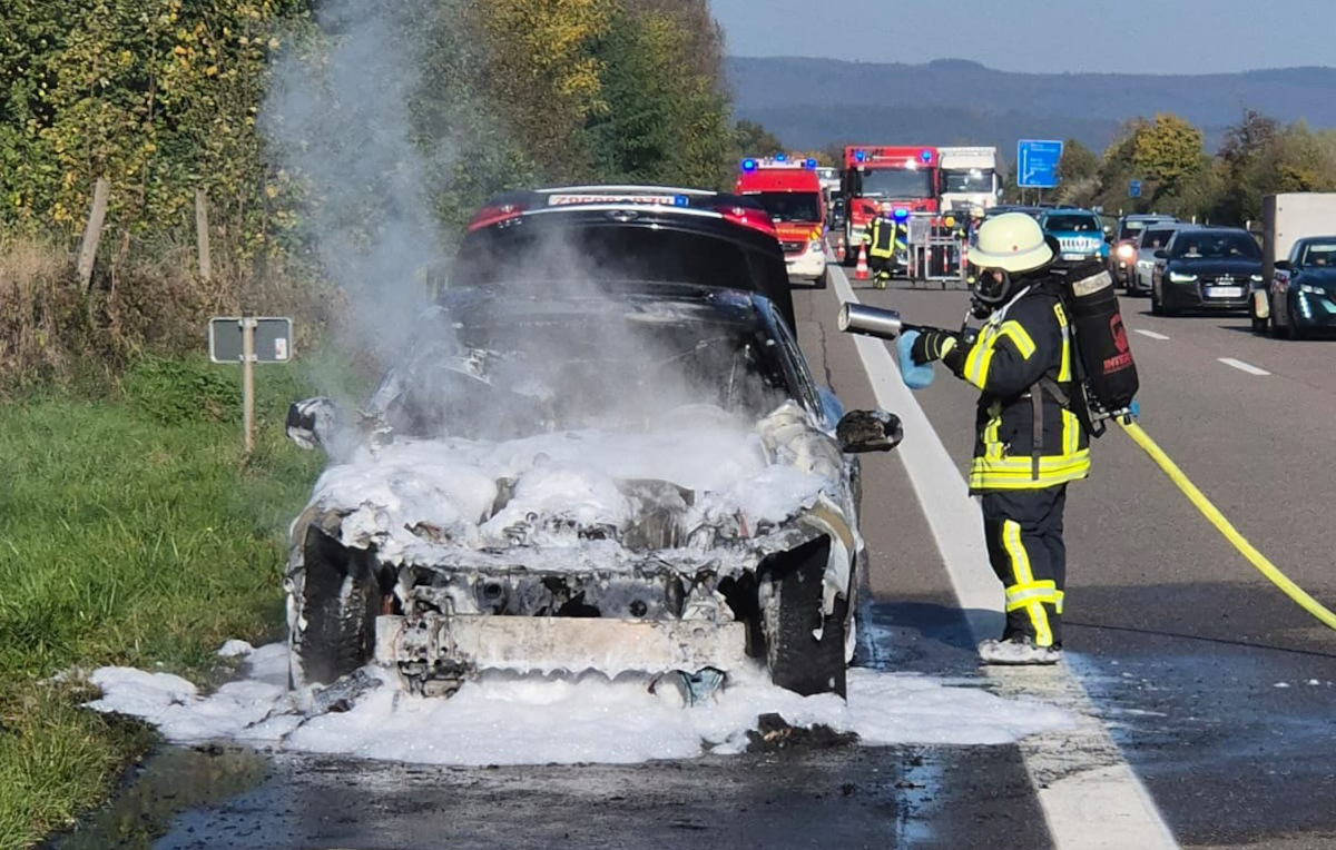 Auto steht auf der A8 lichterloh in Flammen