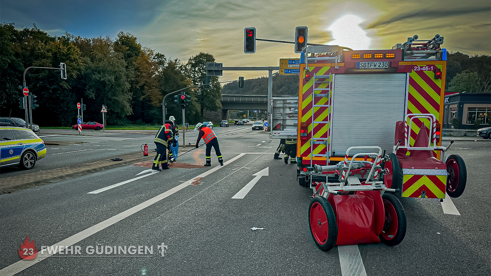 Saarbrücken – Am heutigen Sonntagnachmittag (20. Oktober 2024) wurde die Freiwillige Feuerwehr Güdingen zu einem Unfall auf der B51 an der Kreuzung Wolfseck alarmiert. Der Unfall ereignete sich gegen 16:54 Uhr und betraf ein Motorrad und einen PKW.