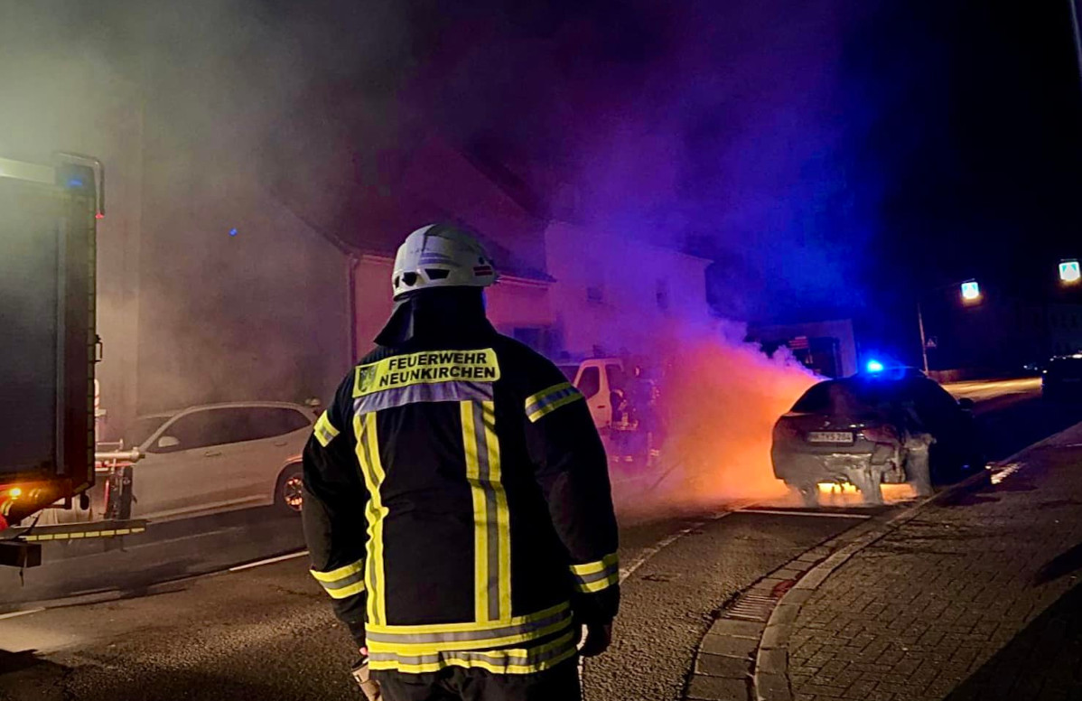 Neunkirchen – In der Nacht zum Samstag (15. Februar 2025) wurden Feuerwehr und Polizei zu einem brennenden Fahrzeug in die Steinwaldstraße gerufen. Um genau 00:59 Uhr alarmierten Anwohner die Einsatzkräfte, nachdem ein 3er BMW in Flammen aufging.