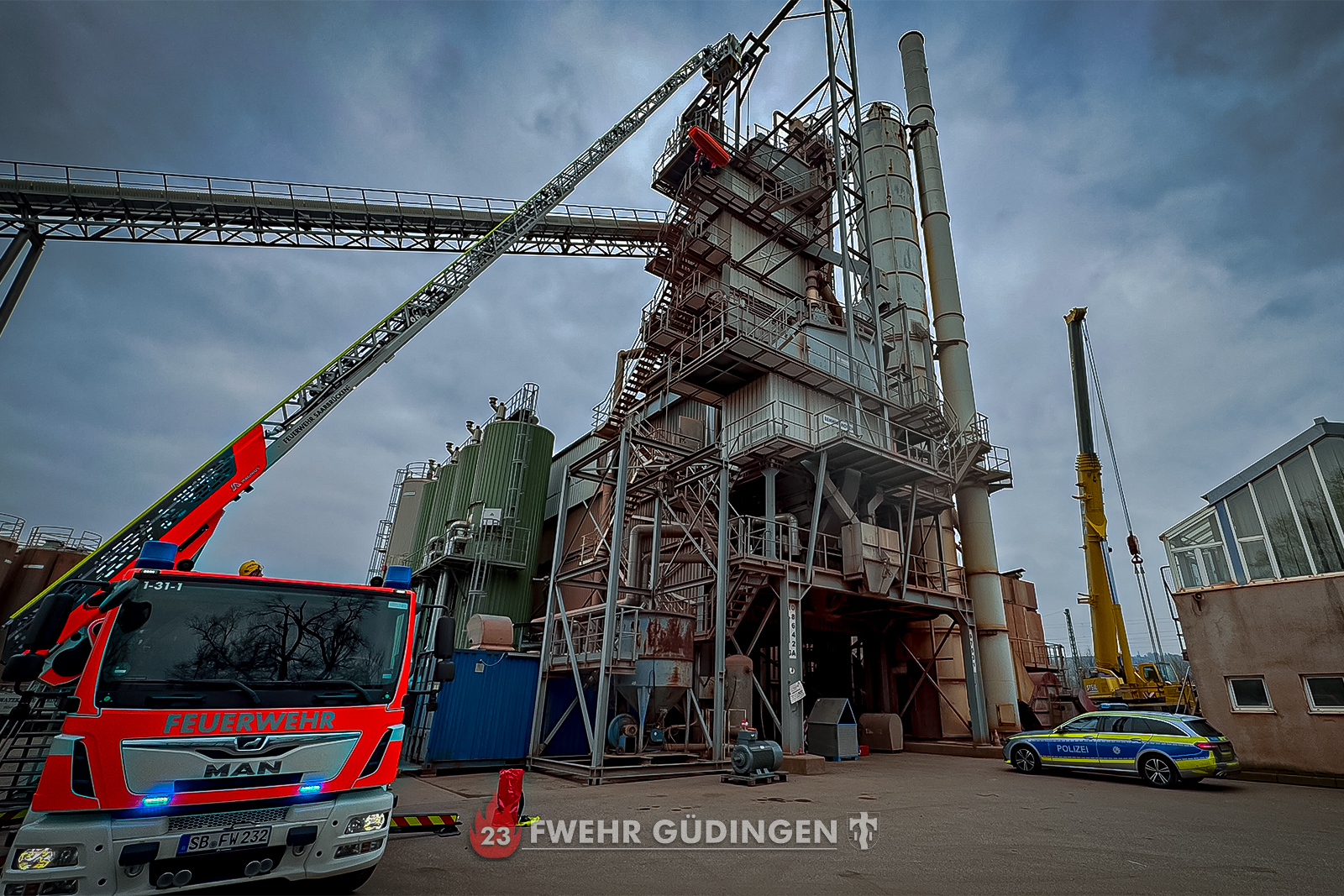Saarbrücken – (Bildergalerie am Ende des Beitrags) Am heutigen Freitagmorgen, dem 14. Februar, wurde die Feuerwehr gegen 11 Uhr zu einem Arbeitsunfall auf das Gelände eines baustoffverarbeitenden Betriebes in Güdingen alarmiert. Ersten Erkenntnissen zufolge war ein Arbeiter in etwa 15 Metern Höhe auf einer Industrieanlage eingeklemmt. Noch vor dem Eintreffen der ersten Feuerwehrkräfte konnte der Mann durch den Rettungsdienst befreit und medizinisch versorgt werden.