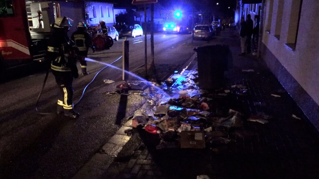Sulzbach – (Bildergalerie am Ende des Beitrags) Am Montagabend gegen 22:30 Uhr wurde die Feuerwehr zu einem Brand vor einem Wohnhaus in der Sulzbachtalstraße (Regionalverband Saarbrücken) alarmiert. Beim Eintreffen der Einsatzkräfte brannte eine Mülltonne, die rasch mit einem Strahlrohr gelöscht werden konnte. Laut Polizei lag die Tonne glücklicherweise weit genug vom Gebäude entfernt, sodass ein Übergreifen der Flammen verhindert wurde.
