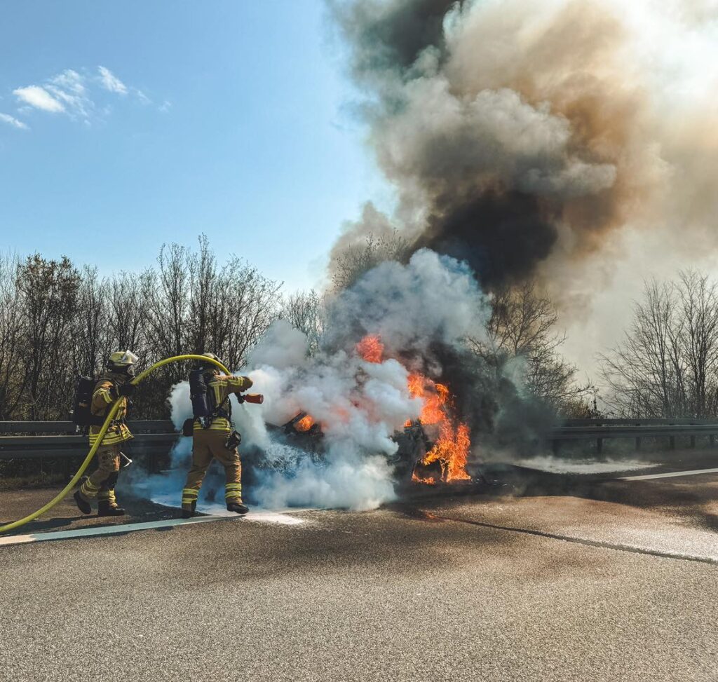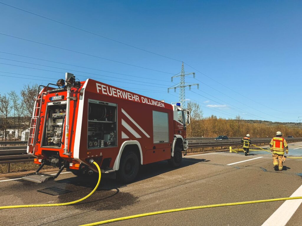 Dillingen – (Bildergalerie am Ende des Beitrags) Am gestrigen Samstagmittag (29. März 2025) wurde der Löschbezirk Dillingen Innenstadt zu einem gemeldeten Pkw-Brand auf der A8 in Fahrtrichtung Luxemburg alarmiert. Bereits aus der Ferne war eine dichte Rauchsäule sichtbar. Ein auf dem Standstreifen abgestelltes Fahrzeug stand in Vollbrand.