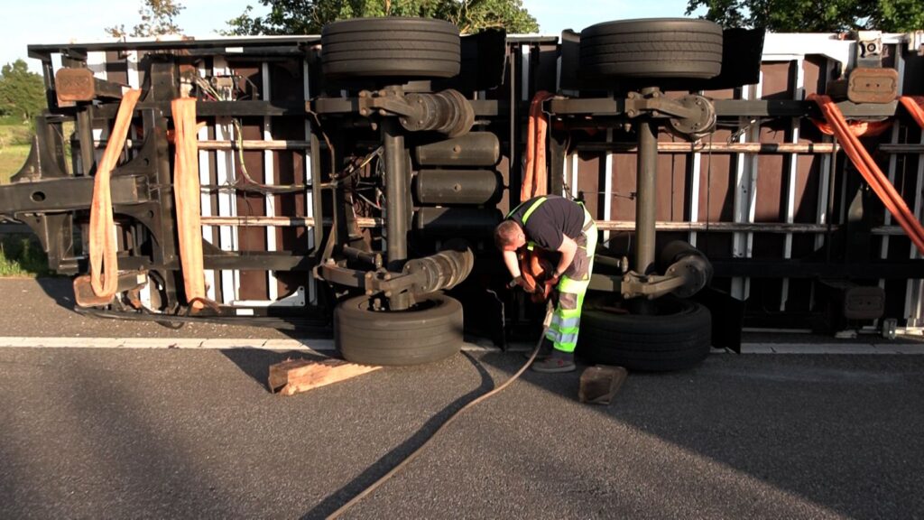 Am Ende steht die Zugmaschine nur noch auf den Vorderrädern – der Anhänger liegt auf der Beifahrerseite. Die erste Überprüfung der Ladungspapiere ergibt: unter den 15 Tonnen Zuladung befinden sich keine gefährlichen Güter. Das Transportunternehmen ist unterwegs im Auftrag von Paketdiensten.