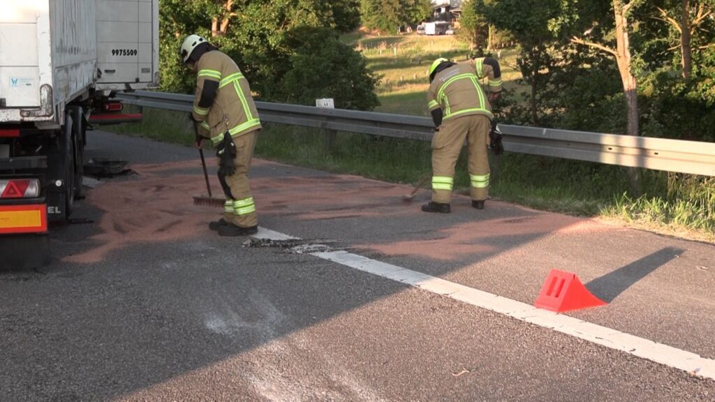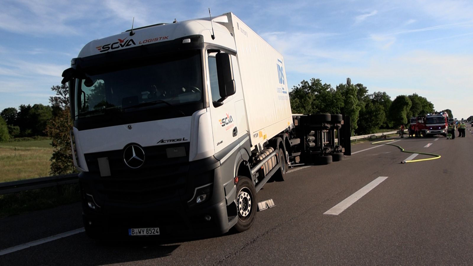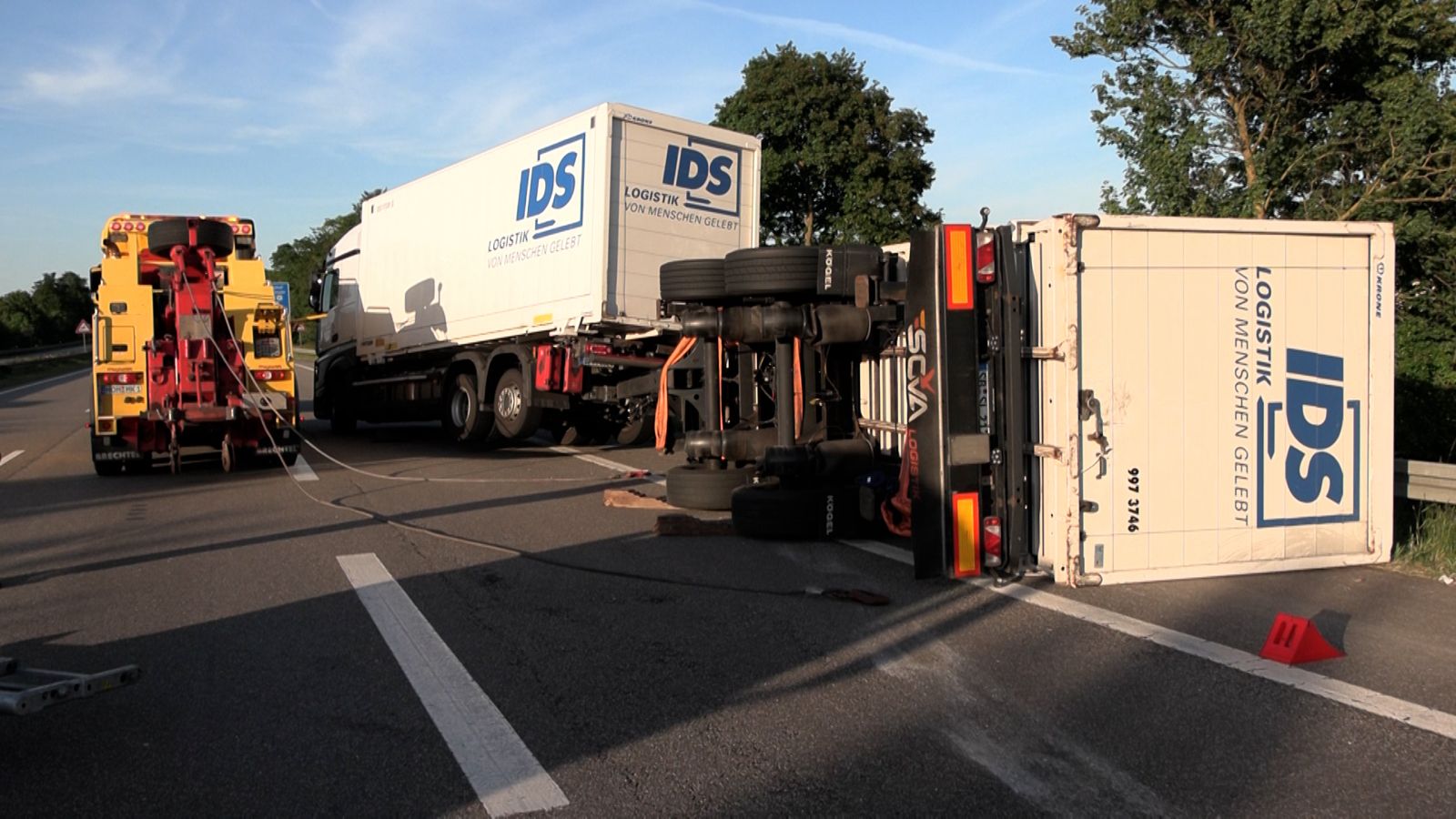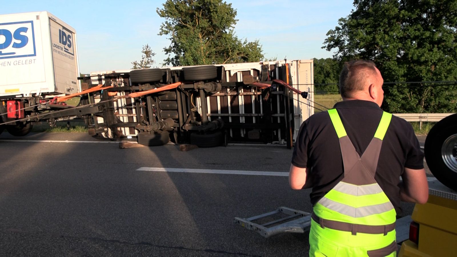 Zum Aufrichten des Anhängers rückt der Abschleppdienst mit zwei Bergefahrzeugen an. Dazu muss die Autobahn fast zwei Stunden lang voll gesperrt werden. Die gute Nachricht: Die Aufrichtung klappt direkt im ersten Anlauf. Doch plötzlich kommt eine unbekannte Flüssigkeit aus dem Anhänger. Die Feuerwehr führt einen Schnelltest durch. Dieser ergibt: Die Flüssigkeit ist ph-neutral und enthält Wasser, aber keine Öle. Erst später wird die Spedition erreicht, die Aufschluss über die Flüssigkeit geben kann. Es handelt sich um Desinfektionsmittel.