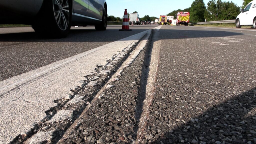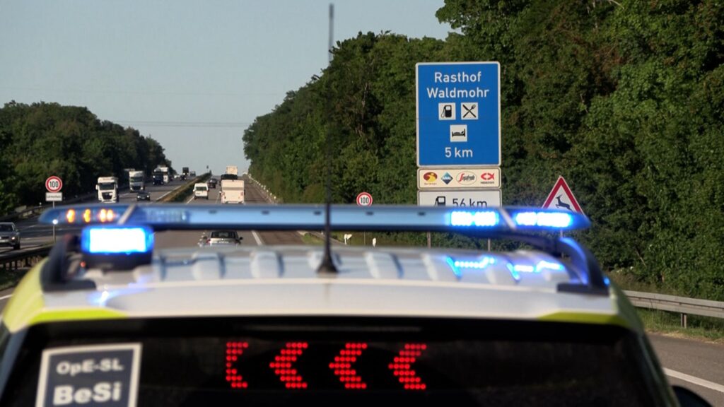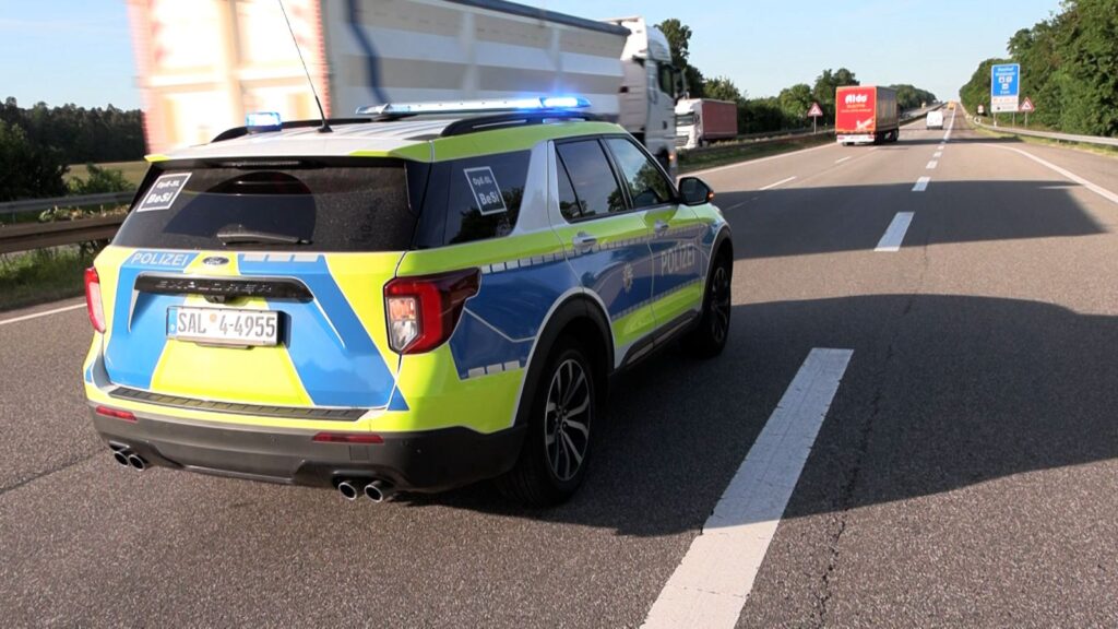 Beim Beschleunigungsstreifen des Rastplatzes gerät der Anhänger nach rechts von der Fahrbahn ab, ergibt die Auswertung der Bremsspuren durch die Verkehrspolizeiinspektion. Dann kippt der Anhänger um, beschädigt dabei mit einer tiefen Furche den Asphalt – und rutscht gut 100 Meter weiter, bis das Lkw-Gespann zum Stehen kommt.