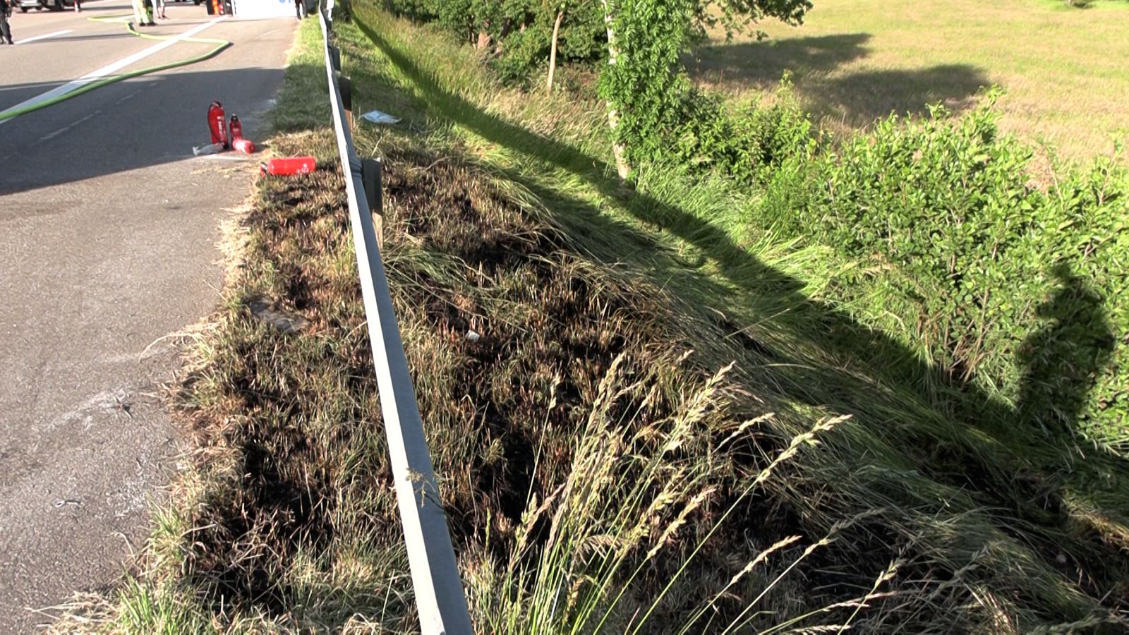 „Während dem Schleifen des Anhängers auf der Straße entfachen die Funken einen Brand des trockenen Grases am Seitenstreifen. Gut 200 Quadratmeter stehen in Flammen. Die zuerst eintreffende Polizei unternahm erste Löschversuche mit Feuerlöschern, bis das Feuer letztendlich durch die Feuerwehr abgelöscht werden konnte“, schildert Homburgs Wehrführer Udo Eckhardt den Ablauf der Löscharbeiten.