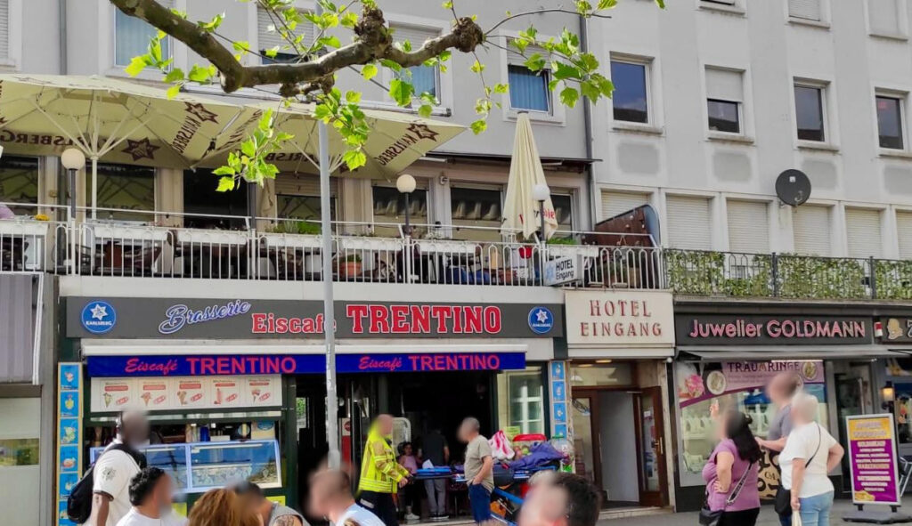 Gegen 15:45 Uhr startete ein Spektakel aus lautstarken Rufen aus dem Hotel-Fenster über dem Juwelier, gefolgt von der deutlich sichtbaren Präsentation eines blanken Hinterteils und freien Oberkörpers – und im Verlauf des Nachmittags flogen auch noch Gegenstände aus dem Hotel-Fenster im zweiten Stock.