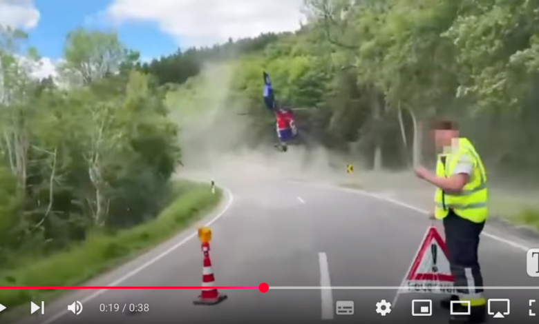 Zu sehen ist der Rettungshubschrauber mit dem Kennzeichen „LX-HLP“, der nach einem Einsatz bei einem Verkehrsunfall auf der N27 in der Nähe von Nothum wieder abheben soll. Die Rotoren drehen bereits, der Heli hebt ab – doch was dann passiert, lässt einem den Atem stocken.