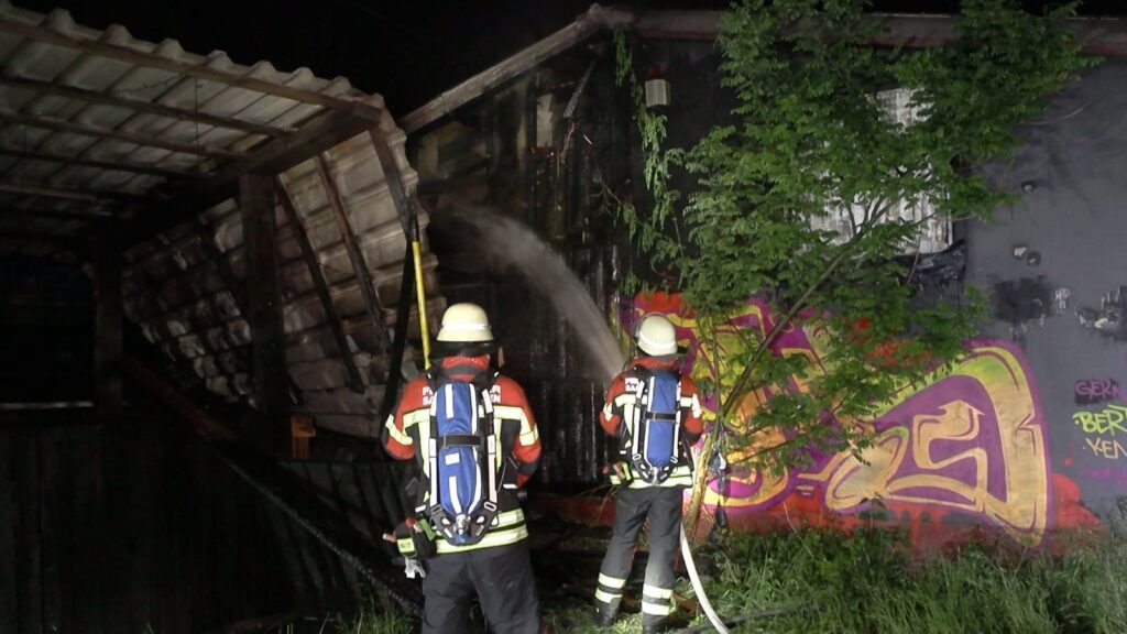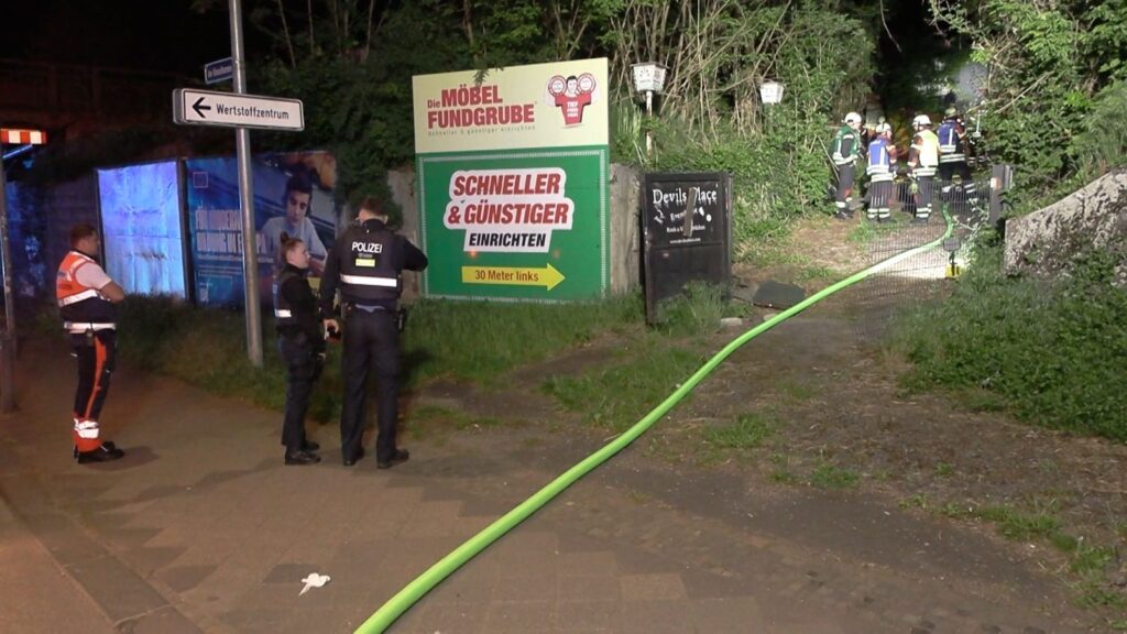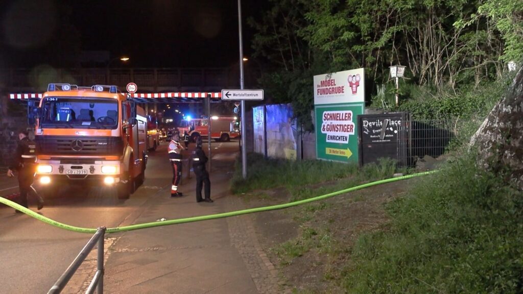Beim Eintreffen der ersten Einsatzkräfte stand die Fassade der ehemaligen Eventhalle „Devils Place“ – einst Clubheim der berüchtigten Rockergruppierung Red Devils MC – in Flammen. Das Feuer griff auch auf ein Aluminiumdach im Außenbereich über, das teilweise einstürzte.