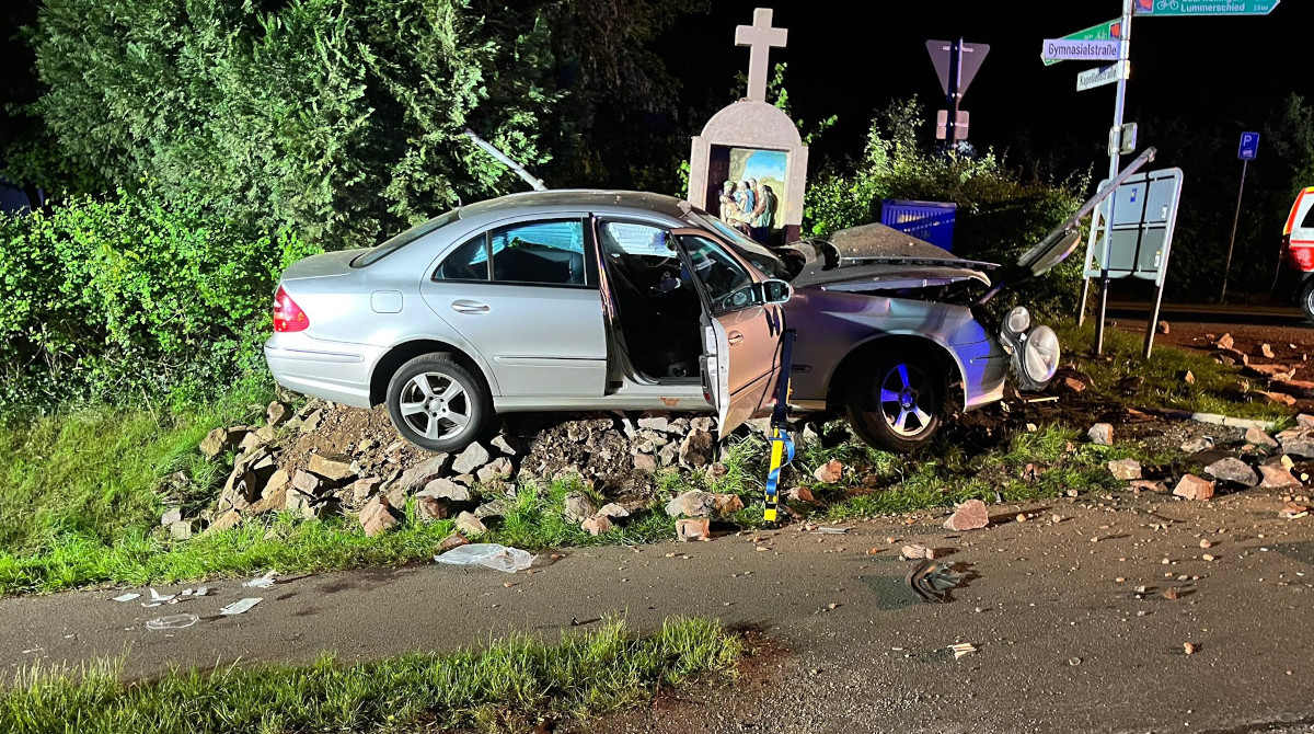 Illingen – In der letzten Nacht (zu Donnerstag 8. Mai 2025) kam es in der Illinger Kapellenstraße zu einem schweren Verkehrsunfall. Ein silberfarbener Pkw kam aus bislang ungeklärter Ursache von der Fahrbahn ab, überfuhr eine Verkehrsinsel und krachte frontal gegen ein gemauertes Wegekreuz. Das Fahrzeug blieb stark beschädigt auf einem Schutthaufen aus losen Steinen liegen, der einst zur Einfassung des religiösen Bauwerks gehörte.