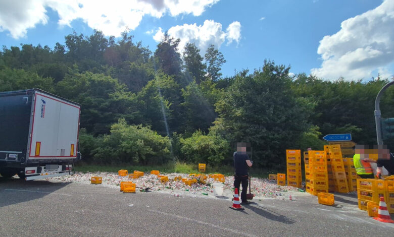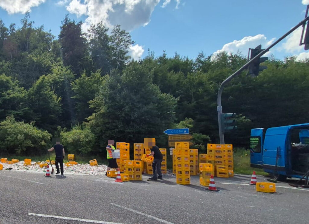 Neunkirchen – Heute (Donnerstag, 24. Juli 2025) kam es gegen 15:30 Uhr auf der B41 in Höhe der Westspange in Neunkirchen zu einem spektakulären Zwischenfall: Ein LKW verlor beim Linksabbiegen in Richtung Autobahn A8 seine komplette Ladung Glasflaschen. Die Folge: ein regelrechtes Trümmerfeld aus zerborstenem Glas, gelben Getränkekisten und zerschellten Flaschen mitten auf der Fahrbahn.