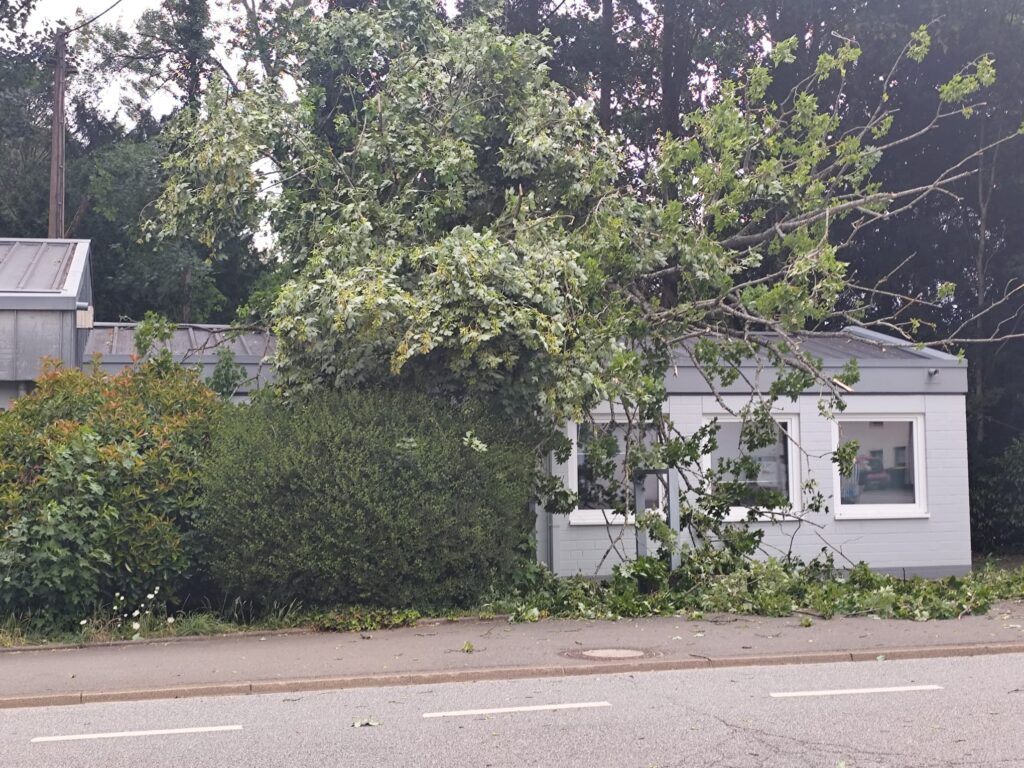 In Fremersdorf krachte ein großer Baum auf das frühere Gebäude der Volksbank. Die Wucht war so massiv, dass der Baum eine Oberleitung mitriss – dabei wurde die Stromanbindung eines benachbarten Hauses buchstäblich aus den Dachziegeln gerissen. Die Feuerwehr sicherte die Gefahrenstelle ab und koordinierte die Stromabschaltung durch den Energieversorger.