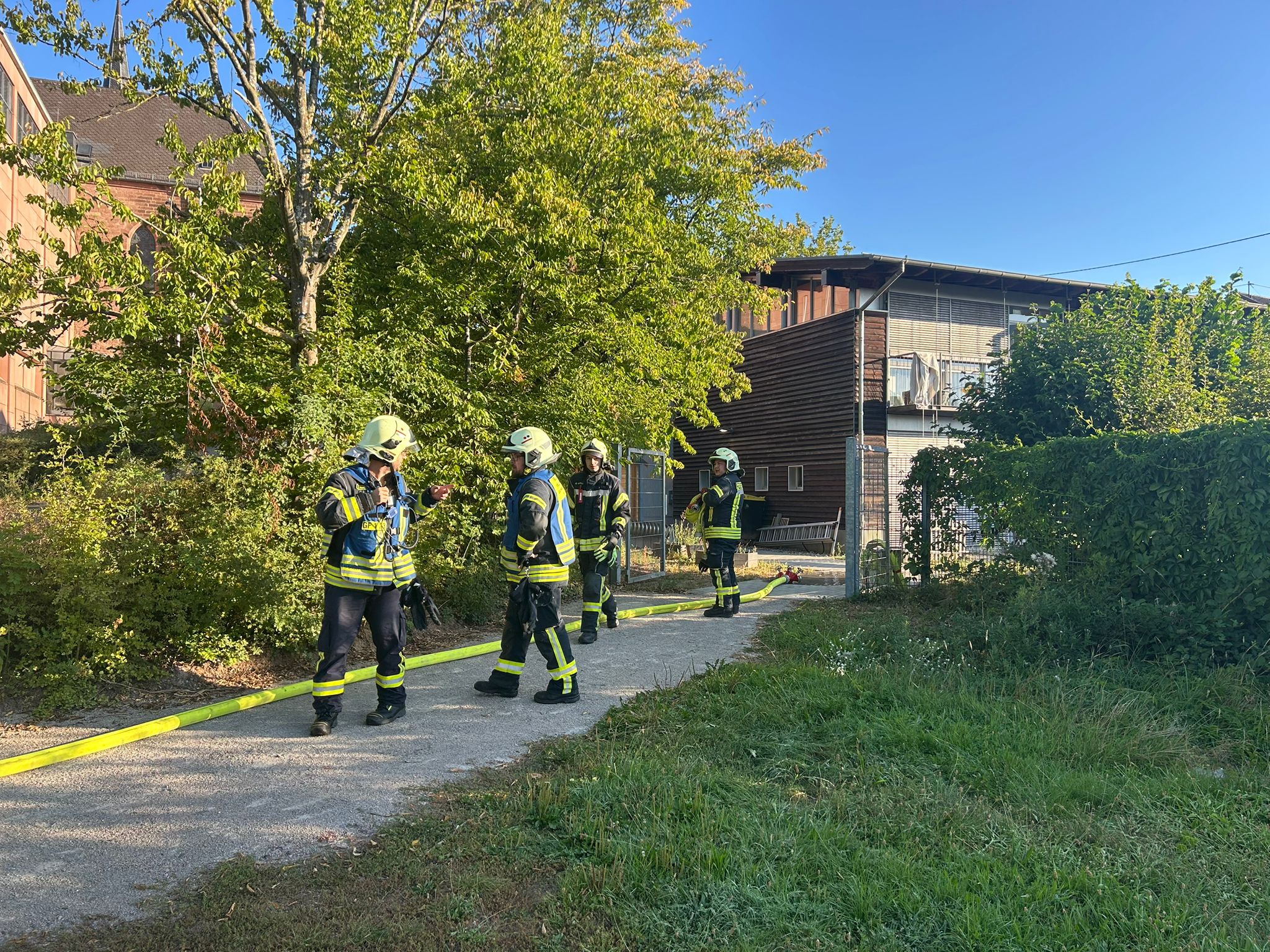 Die Feuerwehr wird alarmiert und sofort mit 25 Mann an, auch der Rettungsdienst geht zunächst vom Schlimmsten aus. Die Betreuerinnen haben schon vor dem Eintreffen der Rettungskräfte zwölf Kinder routiniert ins Freie zur Sammelstelle gebracht.