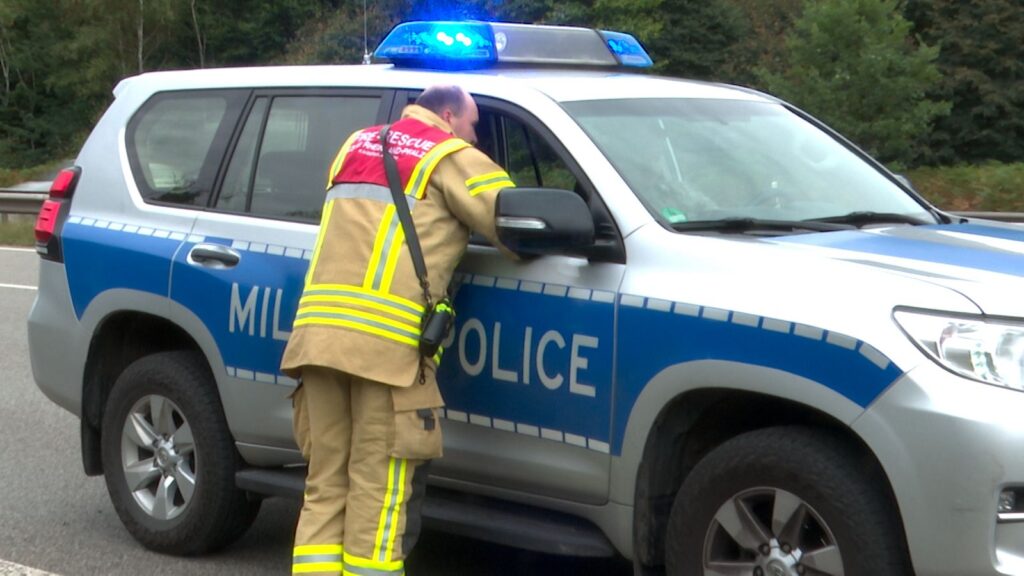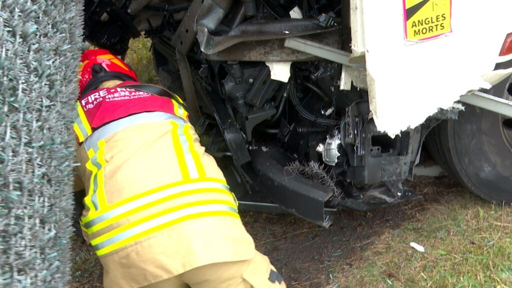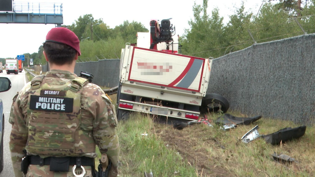 Der Baustoff-Laster mit Kran pflügte weiter durch den Grünstreifen und krachte dann in den Sicherheitszaun mit Sichtschutz und Nato-Stacheldraht der amerikanischen Kaserne „Rhine Ordnance Barracks“ (ROB) und blieb dort beschädigt stehen. Die Military-Police der Ramstein Airbase sicherte die Unfallstelle und den militärischen Sicherheitsbereich. Die amerikanische Fire Brigade rückte aus, um sich um die auslaufenden Betriebsstoffe und um die Erstversorgung des Lkw-Fahrers zu kümmern. Die Umweltspezialisten der amerikanischen Streitkräfte wurden über den Unfall in Kenntnis gesetzt.