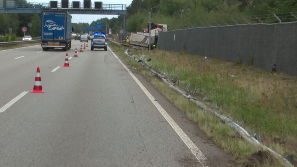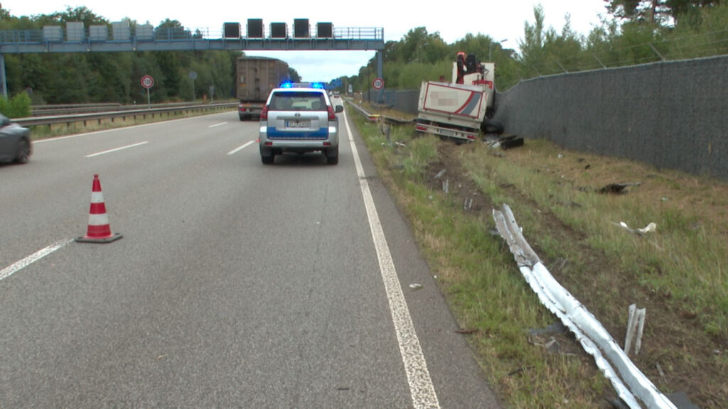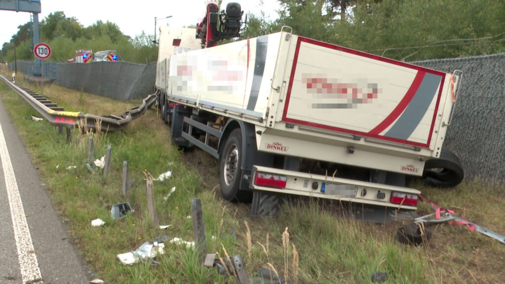 Pfalz – (Von unserem Reporter Thorsten Kremers – Bildergalerie am Ende des Beitrags) Schwerer Lkw-Unfall am heutigen Donnerstagvormittag (4. September 2025) gegen 11:30 Uhr auf der A6 Kaiserslautern – Saarbrücken zwischen Kaiserslautern-West und Kaiserslautern-Einsliedlerhof: Ein 40-Tonner-Gespann geriet aus bislang ungeklärter Ursache nach rechts von der Fahrbahn ab und beschädigte dabei mehr als 100 Meter Leitplanke, die sich zum Teil mit der Front des Lasters verkeilte und verbog.