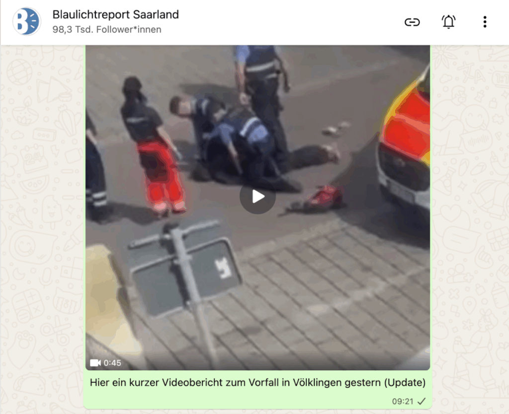+++ARTIKELUPDATE (9:03 Uhr) +++ Völklingen – Es sind verstörende Szenen, die viral gehen: Am gestrigen Dienstagnachmittag (9. September 2025) gegen 14 Uhr wurde eine Person von der Polizei in Völklingen durch mehrere Beamte auf dem Boden fixiert, der Rettungsdienst stand bereit. Während der Festnahme rief die Person unentwegt „Allahu Akbar“, ist in den Aufnahmen deutlich zu hören.