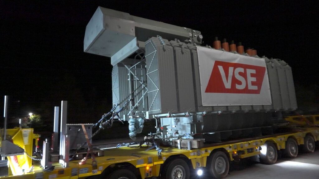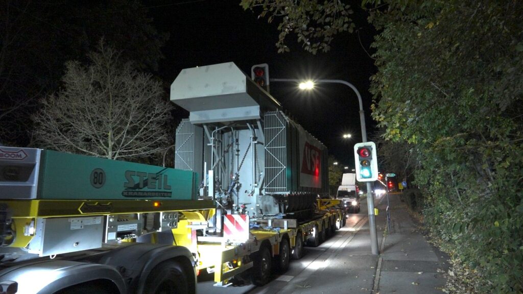 Auf dem Transporter geladen: Ein nagelneuer 94-Tonnen-Rumpftrafo. Der Trafo-Koloss ist 7,50 Meter lang, 3,30 Meter breit und 3,50 Meter hoch. Bei der Einspeisung liefert er 110 kV, bei der Ausspeisung kommen 20 kV zum Tragen und die Leistung beträgt 80 MVA.
