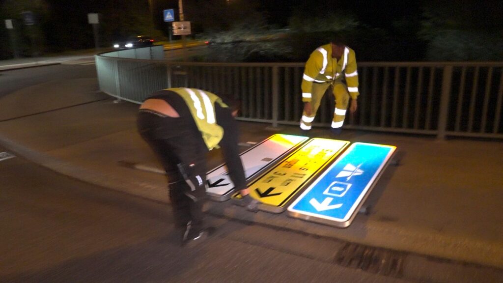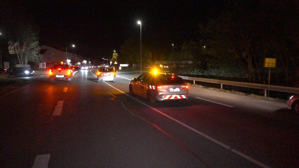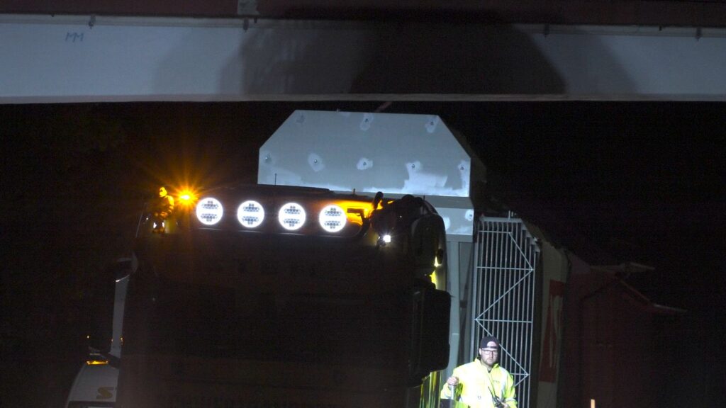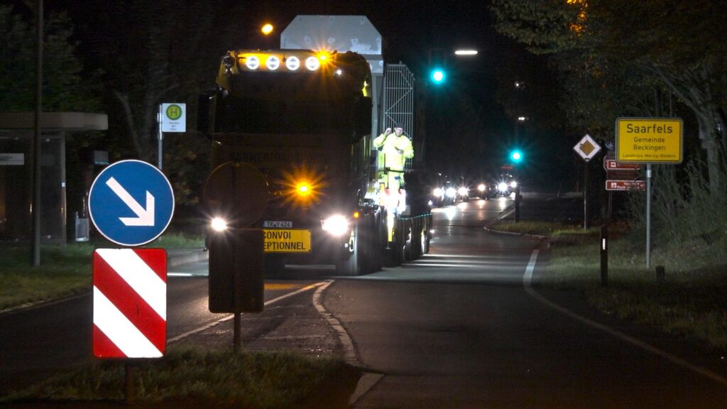 Saarland – (Von unserem Reporter Thorsten Kremers – Video und Bildergalerie am Ende des Beitrags) Jede Menge flackerndes Gelblicht, Begleitfahrzeuge, im Gegenverkehr unterwegs, zügig abmontierte Verkehrsschilder, über Verkehrsinseln, zentimeterknapp unter Brücken und Ampelmasten durch: Am Abend war ein Schwertransport über Land unterwegs vom saarländischen Merzig (Kreis Merzig) zum Amprion Umspannwerk in Uchtelfangen (Kreis Neunkirchen).