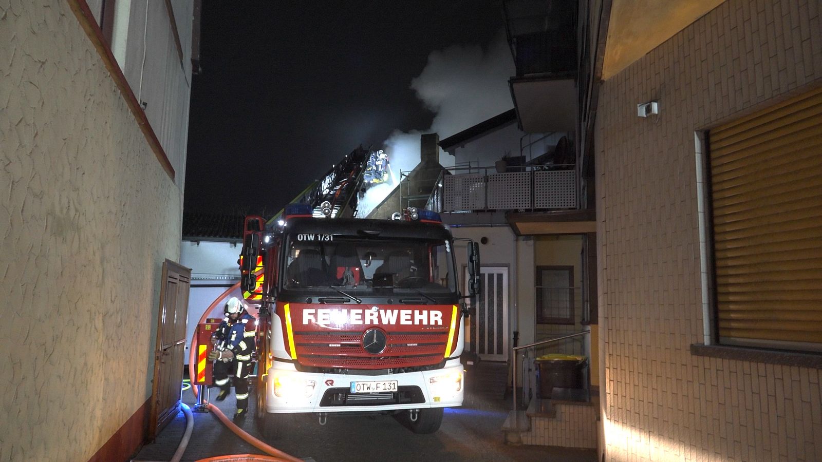 Die Feuerwehr war mit einer Drehleiter und mehreren Rohren im Einsatz. Zunächst wurde mit Wasser gelöscht, später mit Netzmittel, um letzte Glutnester besser zu erreichen. Gegen 02:30 Uhr war das Feuer unter Kontrolle, anschließend begannen umfangreiche Nachlöscharbeiten. Die Giebelseite des betroffenen Hauses ist einsturzgefährdet. Daher wurde ein Baufachberater des Technischen Hilfswerks (THW) hinzugezogen, um die Statik zu beurteilen.