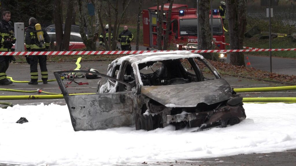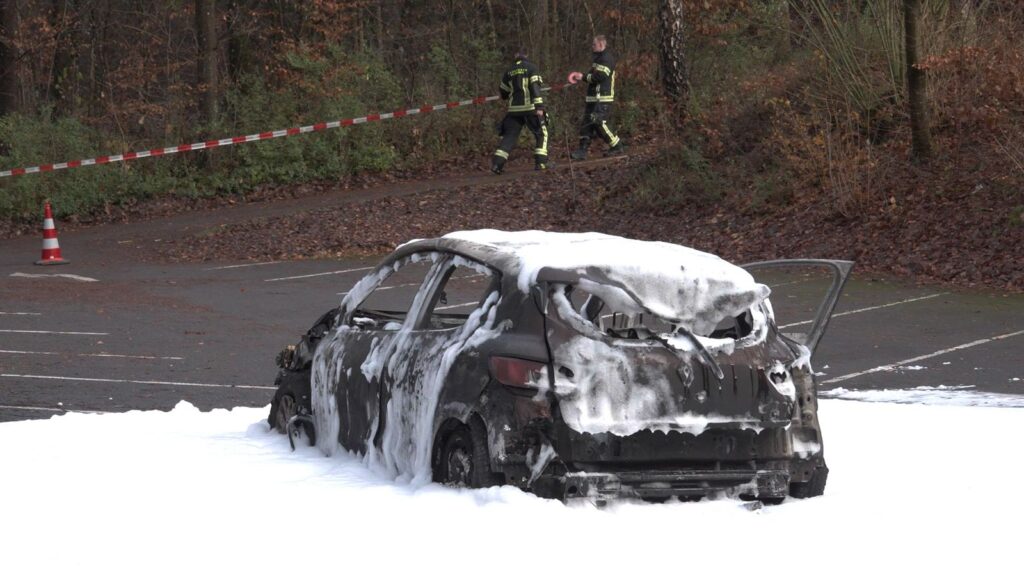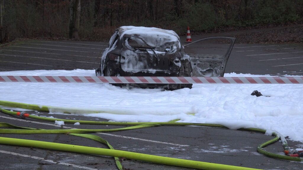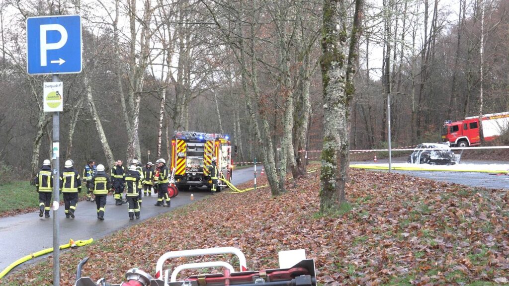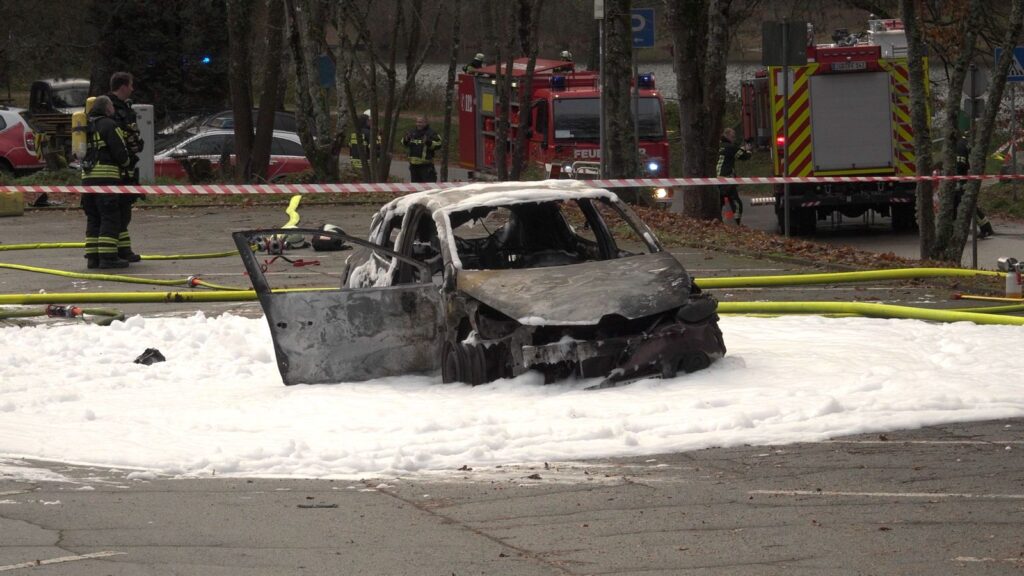 St. Ingbert-Rohrbach – (Von unserem Reporter Thorsten Kremers – Bildergalerie am Ende des Beitrags) Ein dramatischer Einsatz erschütterte am frühen Montagnachmittag (24. November 2025) das Naherholungsgebiet am Glashütter Weiher. Gegen 13:45 Uhr wurden Feuerwehr und Rettungsdienst zu einem Fahrzeugbrand auf einem Parkplatz nahe des beliebten Spazierwegs alarmiert.