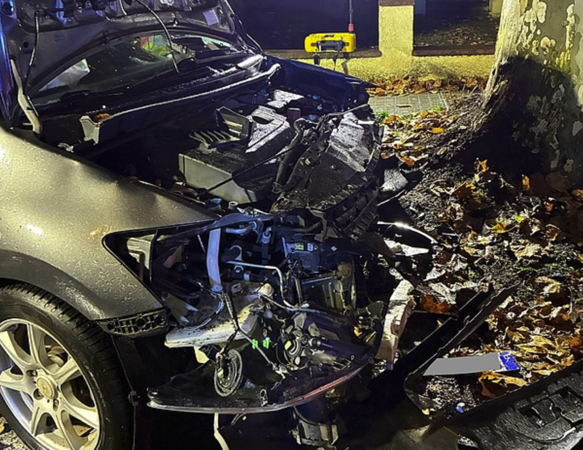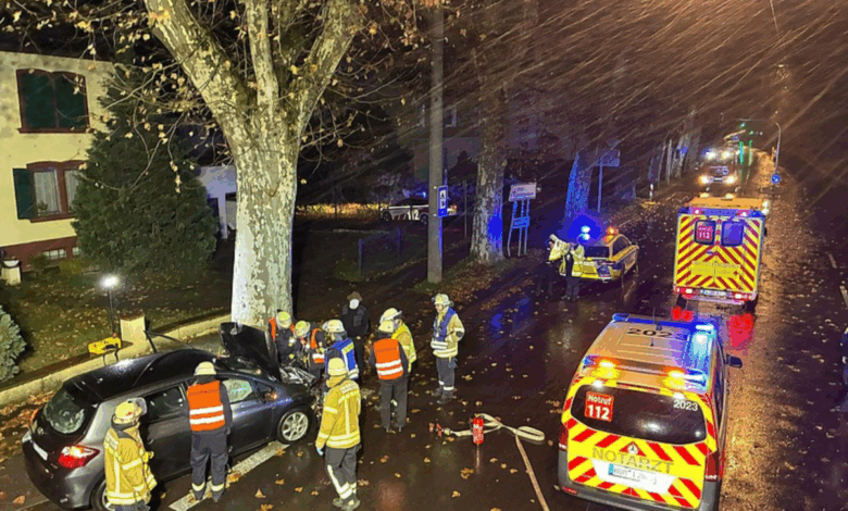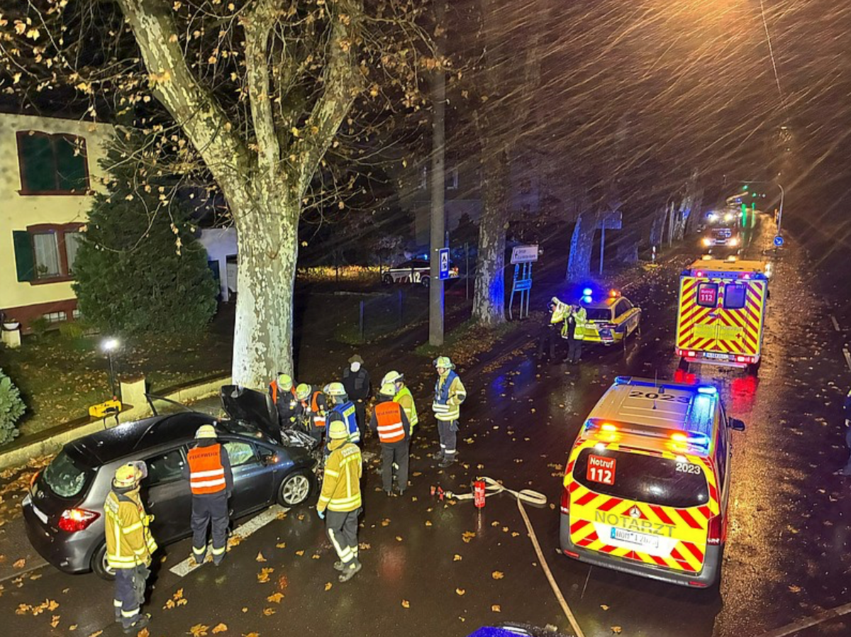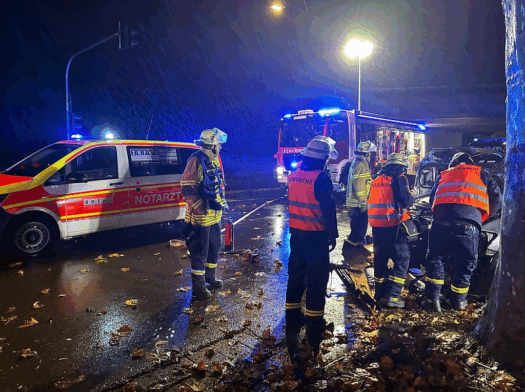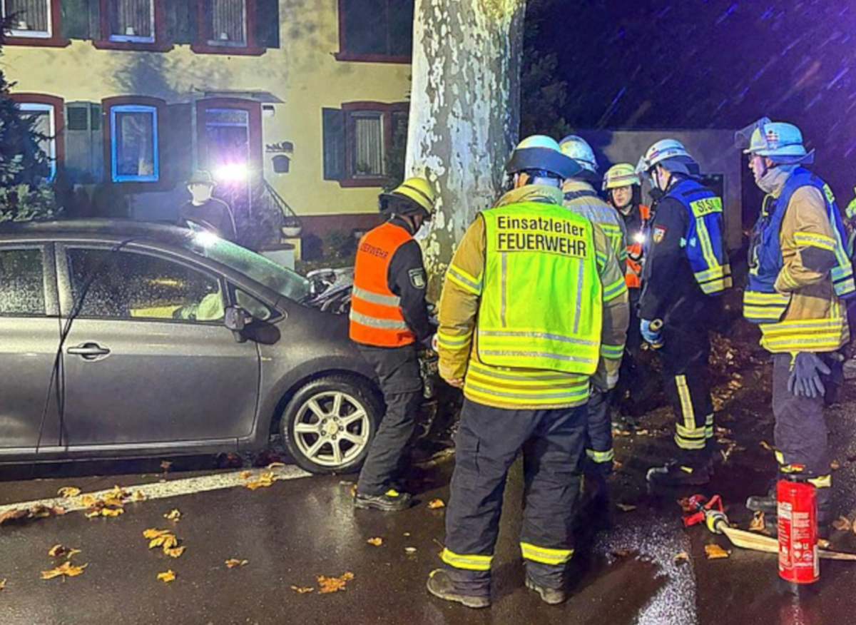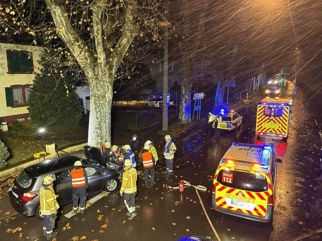 Bereits wenige Minuten nach dem Alarm trafen die ersten Einsatzkräfte ein. Vor Ort bestätigte sich die dramatische Meldung: Ein dunkelgrauer Toyota Yaris war auf der regennassen Straße außer Kontrolle geraten, gegen einen Baum geprallt und schwer beschädigt.