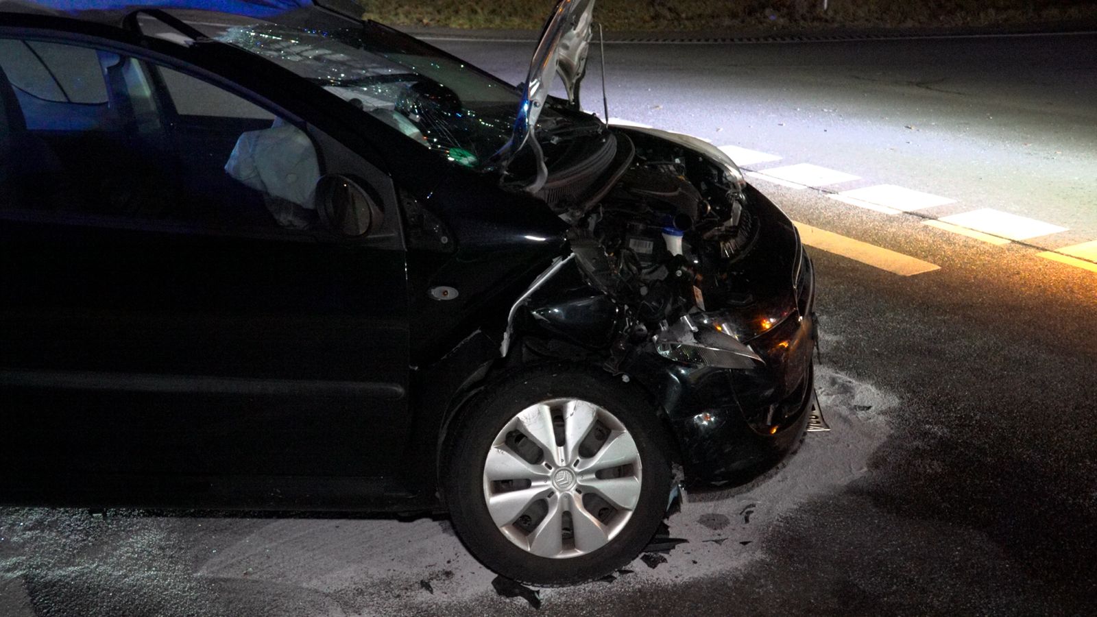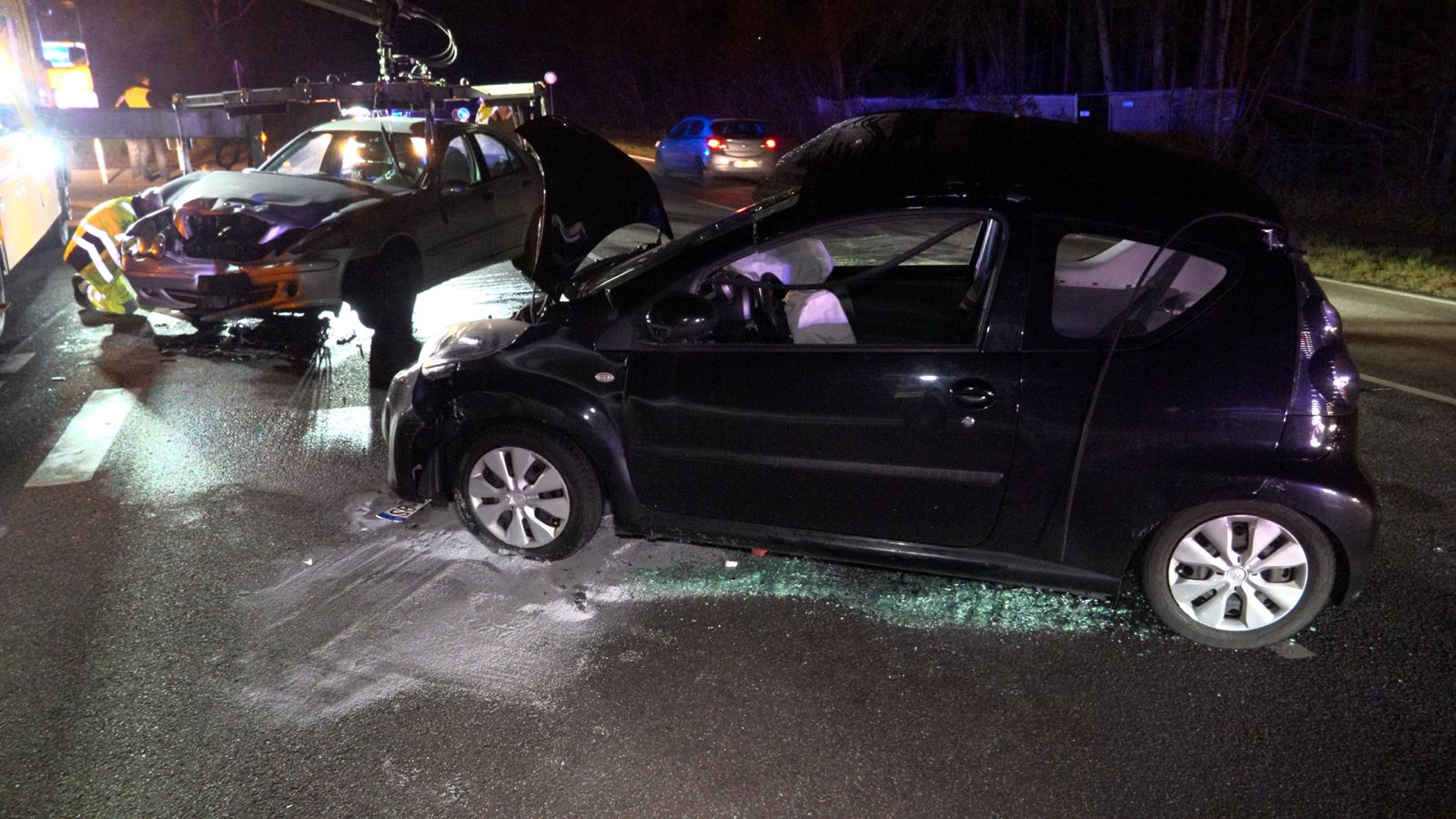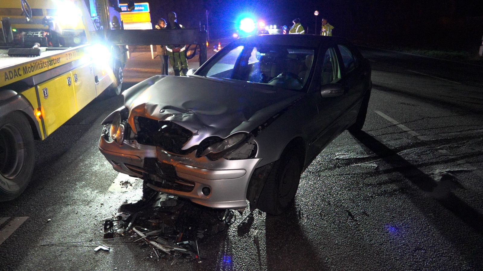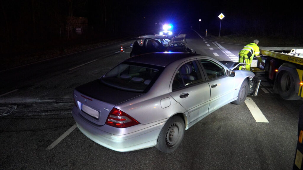 Auch der Mercedes wurde im Frontbereich stark beschädigt. Beide Fahrzeuge verloren Betriebsstoffe, weshalb die Feuerwehr zudem Sicherungsmaßnahmen durchführte und die Batterien abklemmte.