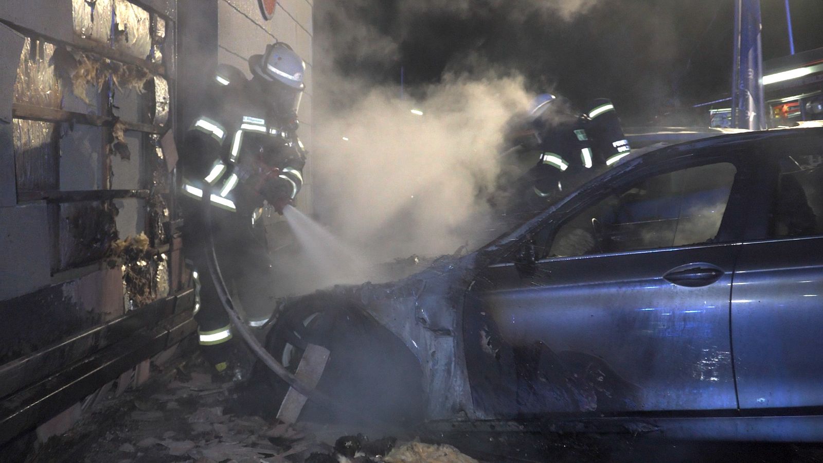Beim Eintreffen der Polizei stand ein 5er-BMW in Vollbrand. Das Feuer griff auf einen daneben stehenden abgemeldeten VW Polo über. Auch griffen die Flammen über auf die Vertäfelung des Hauses. Das schnelle Eingreifen der Feuerwehr Sulzbach verhinderte Schlimmeres: Die Flammen konnten schnell unter Kontrolle gebracht werden.