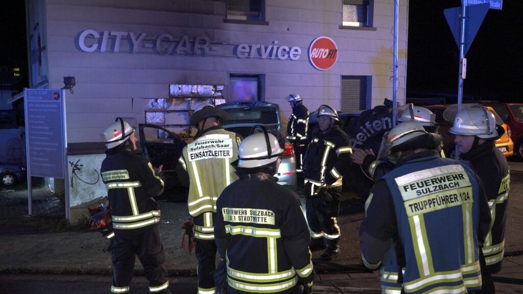 Sulzbach – (Von unserem Reporter Thorsten Kremers – Bildergalerie am Ende des Beitrags) Sirenenalarm in der Nacht auf Samstag (15. November 2025) um 2:30 Uhr im Sulzbacher im Fischbacher Weg / Ecke Goldene-Au-Straße: Am Notruf wurde mitgeteilt, dass dicht vor dem Gebäude von „City Car-Service“ ein brennendes Auto steht.