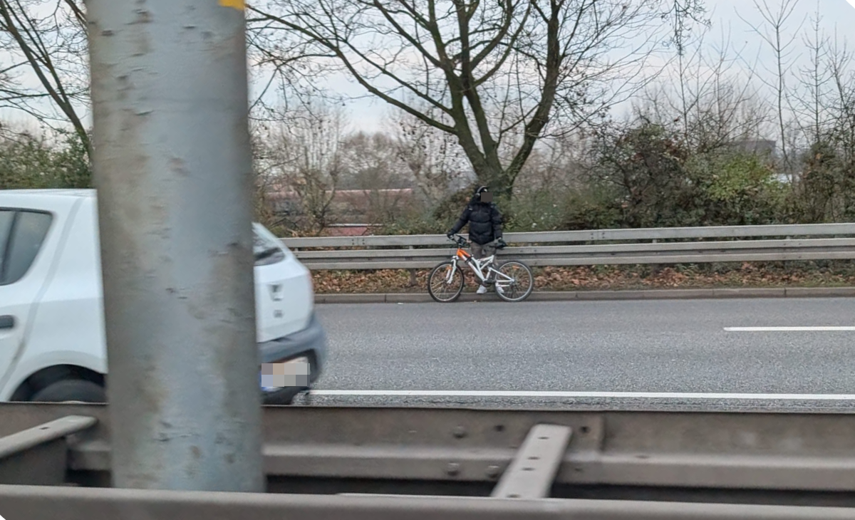 Ein Leserreporter, der die Situation aus seinem Auto beobachtete, schilderte, der Mann habe mehrfach auf den Verkehr geschaut und gewirkt, als wolle er den richtigen Moment abpassen, um loszugehen. Sein Beifahrer hielt die Situation in Fotos fest, auf denen deutlich zu erkennen ist, wie der Radfahrer mit einem Mountainbike am äußeren Rand der Autobahn steht.