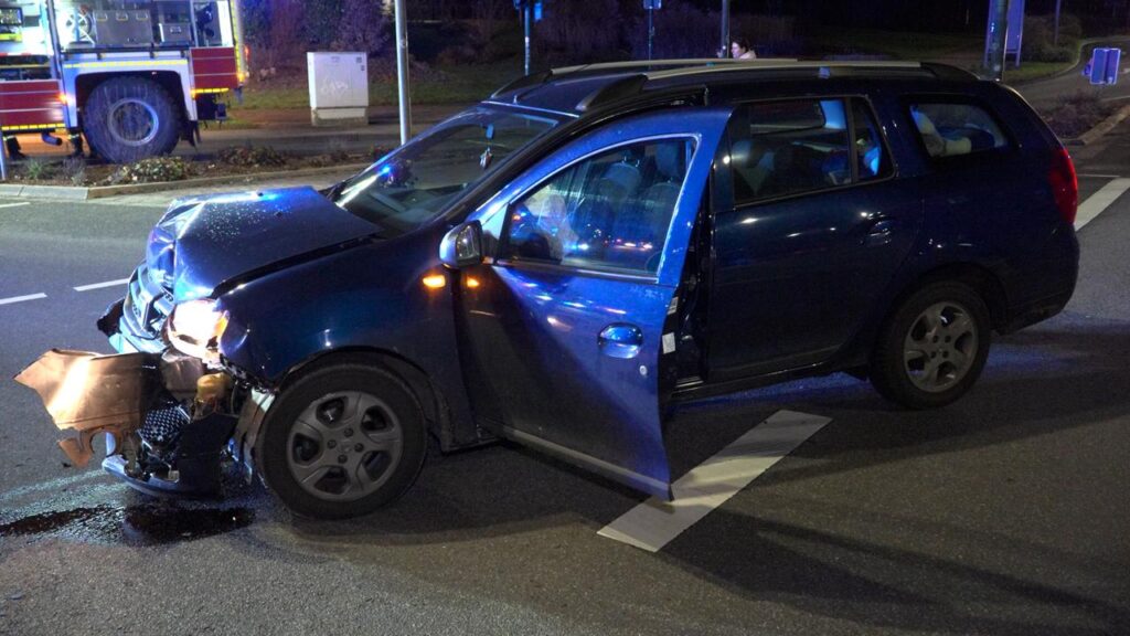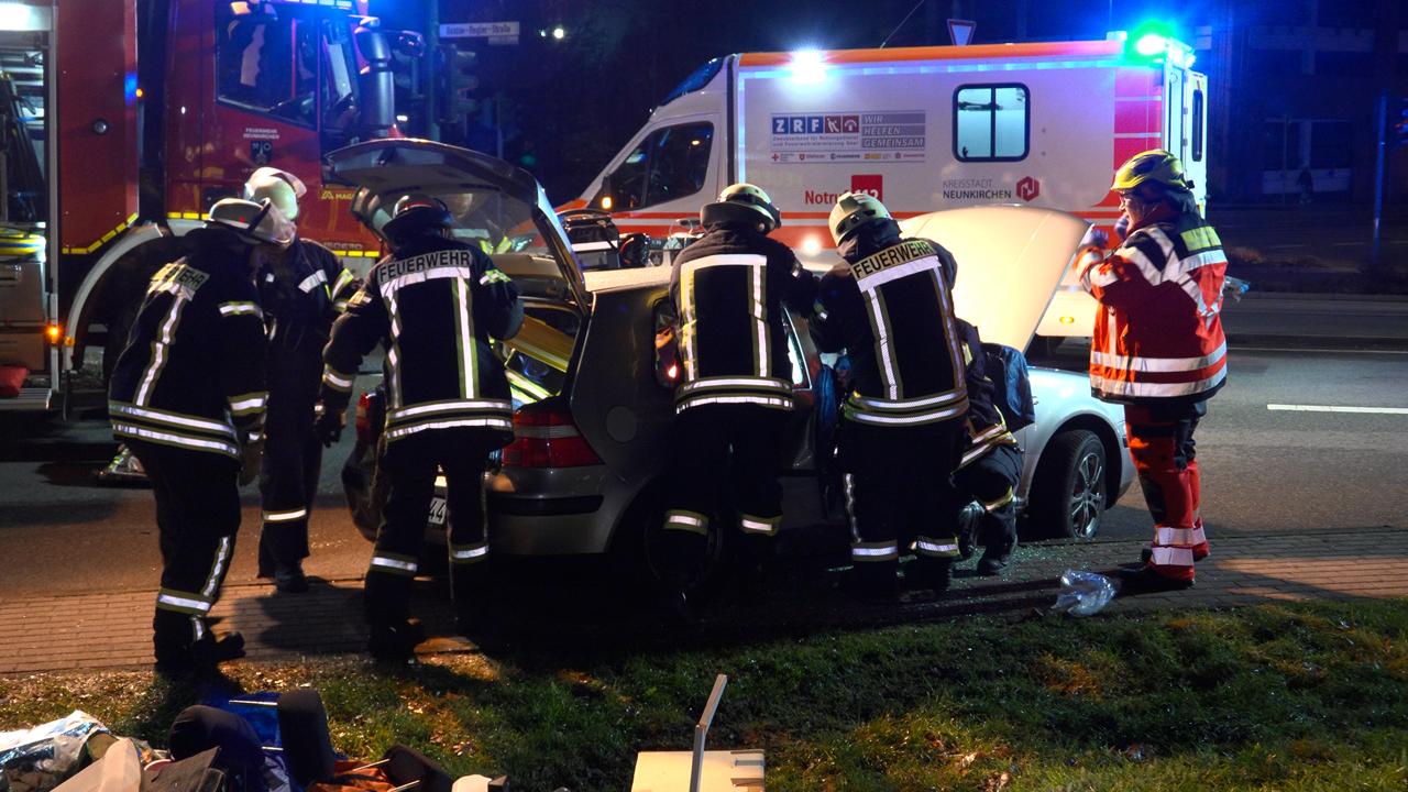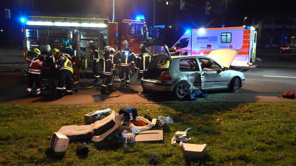 Nach bisherigen Erkenntnissen war der VW aus Richtung Wiebelskirchen unterwegs, als es im Kreuzungsbereich zum Zusammenstoß mit einem Dacia kam, der aus Richtung Ottweiler anfuhr. Durch die Wucht des Aufpralls wurde der VW über die gesamte Kreuzung hinweg auf einen Grünstreifen neben dem Fußgängerweg geschleudert.