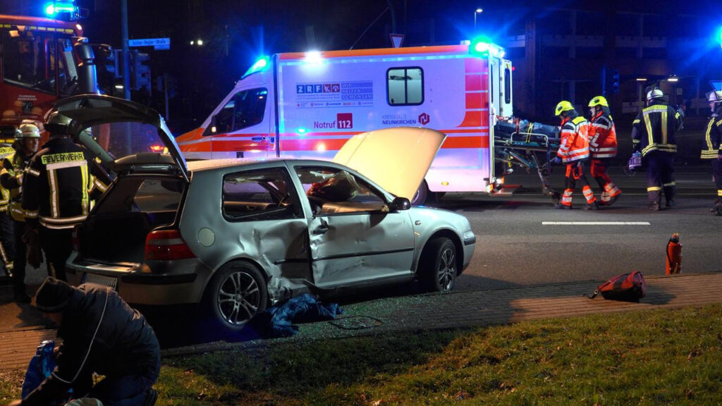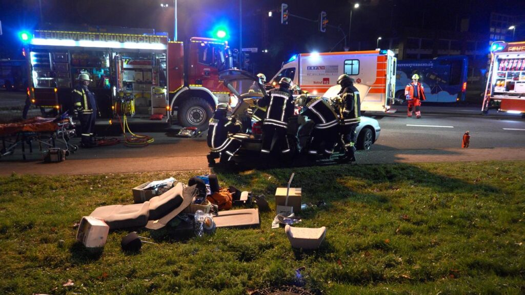 Neunkirchen – (Von unserem Reporter Thorsten Kremers – Bildergalerie am Ende des Beitrags) Bei einem schweren Verkehrsunfall am Montagmorgen, 15. Dezember 2025, sind in Neunkirchen drei Frauen verletzt worden. Gegen 6:15 Uhr kam es an der Kreuzung Lindenallee/Gustav-Regler-Straße zu einer Kollision zwischen einem VW und einem Dacia.