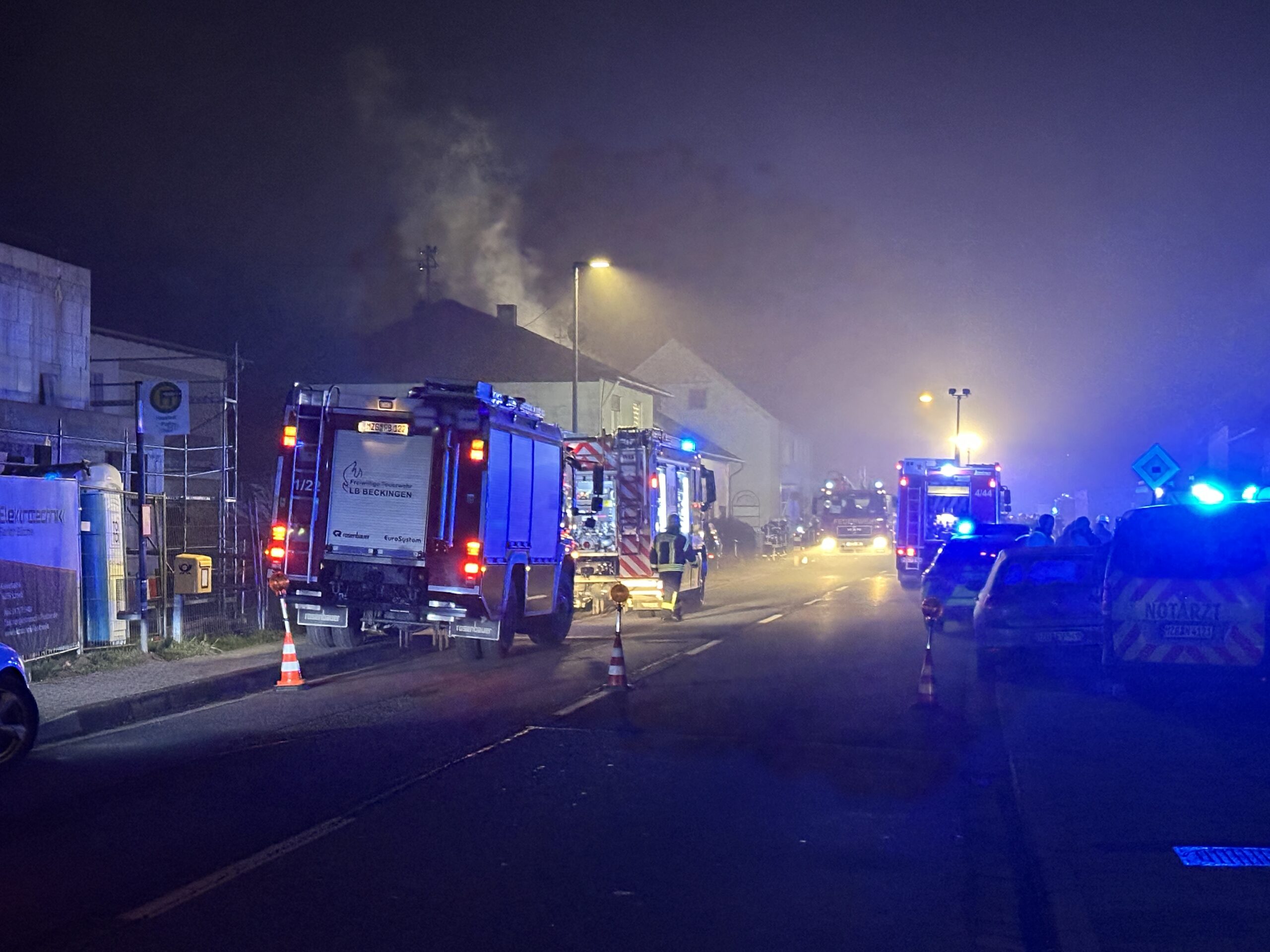Beckingen – (Von unserem Reporter Thorsten Kremers – Bildergalerie am Ende des Beitrags) Ein Wohnhausbrand hat am Sonntagabend (21. Dezember 2025) den Ortskern von Beckingen-Haustadt in Atem gehalten. Gegen 21 Uhr wurden die Feuerwehren per Sirenenalarm zu einem Brand in der Haustadter Talstraße (L156) in Höhe der Einmündung Reitersbruch gerufen. Nur wenige Minuten zuvor war die Lichterfahrt durch Beckingen zu Ende gegangen, deren Absicherung viele Feuerwehrkräfte übernommen hatten.