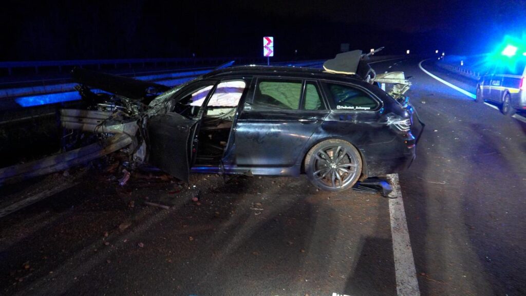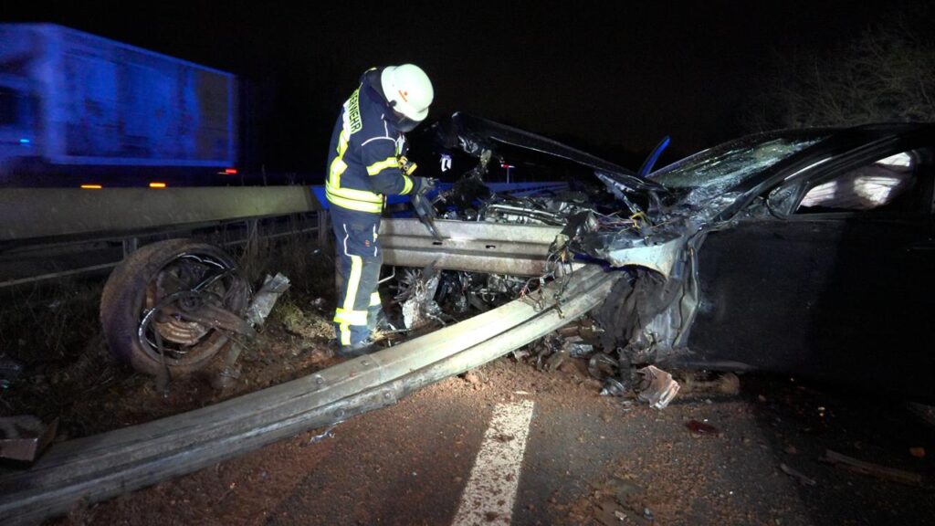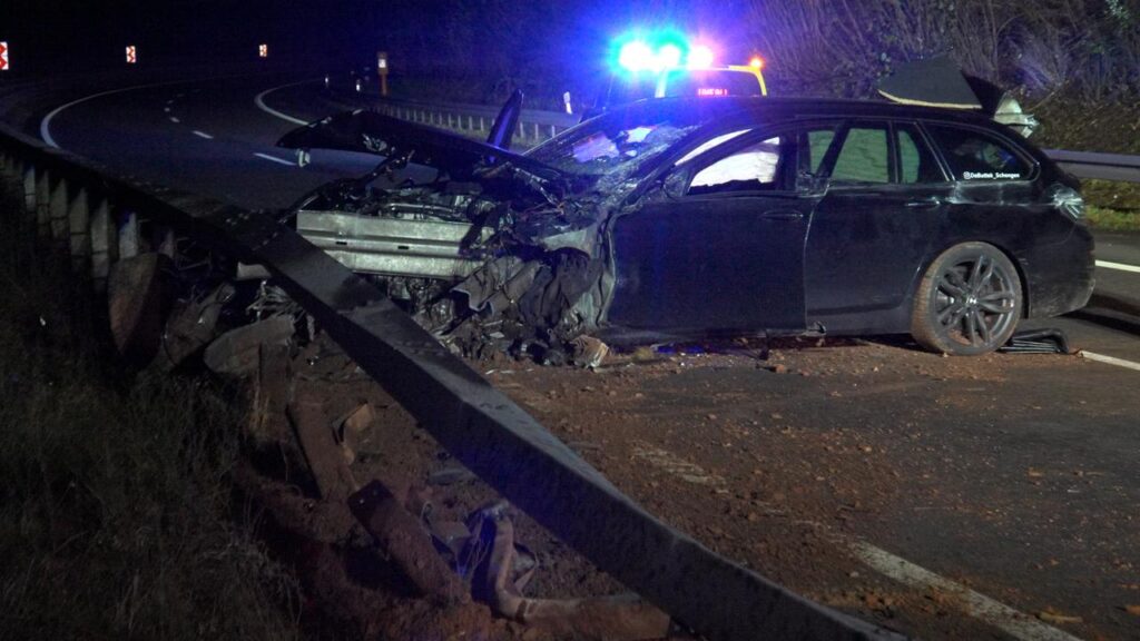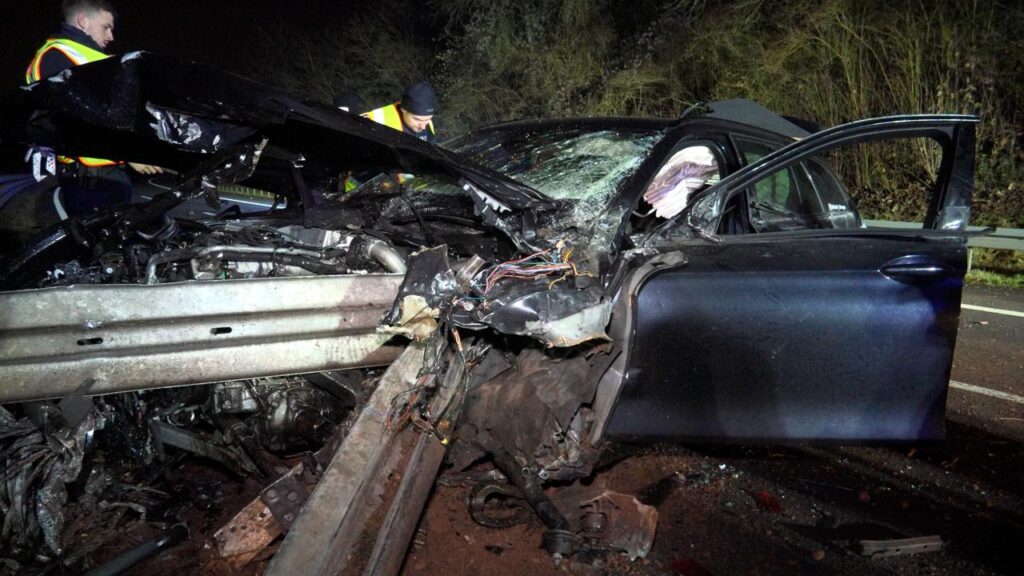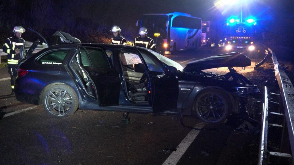 Rehlingen – (Von unserem Reporter Thorsten Kremers – Bildergalerie am Ende des Beitrags) Schwerer Unfall in der Nacht von Sonntag auf Montag (15. Dezember 2025) auf der A8 Luxemburg in Richtung Karlsruhe: Zwischen Rastplatz Niedmündung und Rehlingen (Kreis Saarlouis) kommt gegen 2:45 Uhr in einer Rechtskurve ein luxemburgischer BMW zunächst nach rechts von der Fahrbahn ab, schleudert dann vom Grünstreifen weiter bis zur Mittelleitplanke.