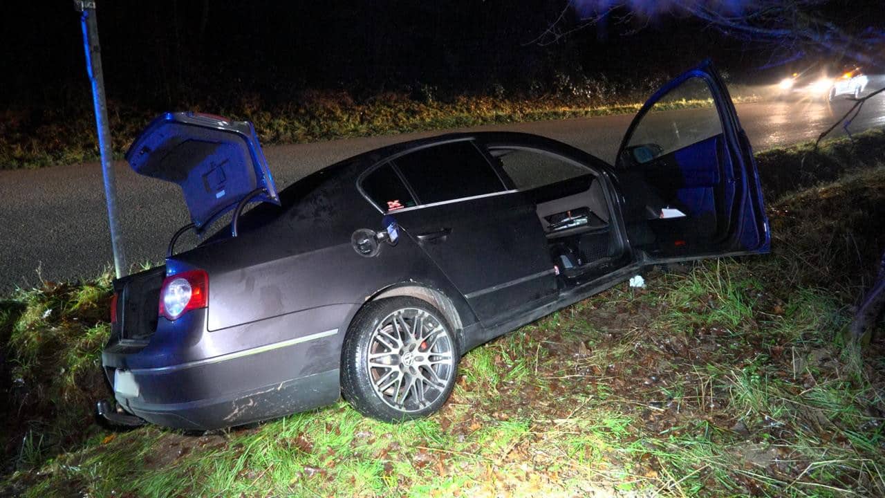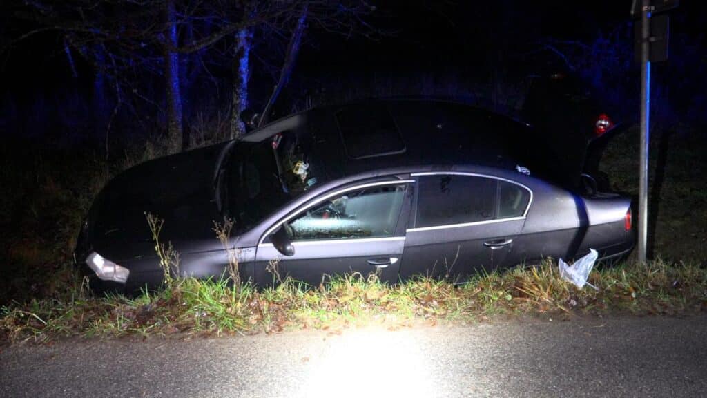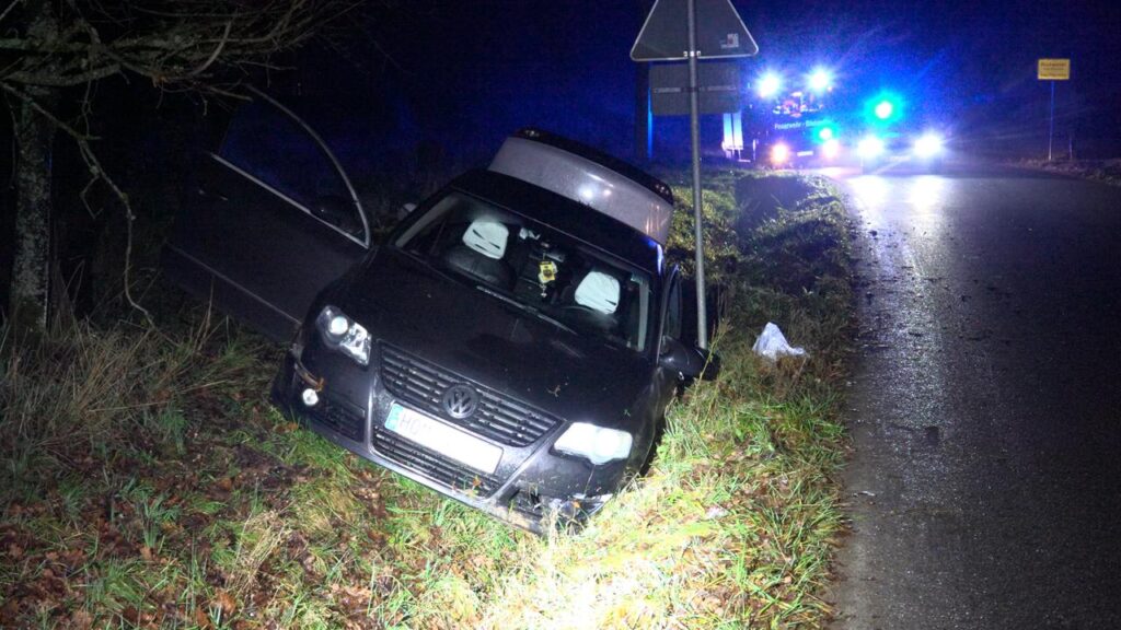 Nach Angaben der Polizei kam es gegen 5.30 Uhr zur Kollision eines VW mit einem Wildtier. Durch den Aufprall verlor der Fahrer die Kontrolle über das Fahrzeug, das anschließend in den Straßengraben schleuderte. Dort verkeilte sich der Wagen in einer Regenablaufrinne so ungünstig, dass sich die Fahrertür nicht mehr öffnen ließ.