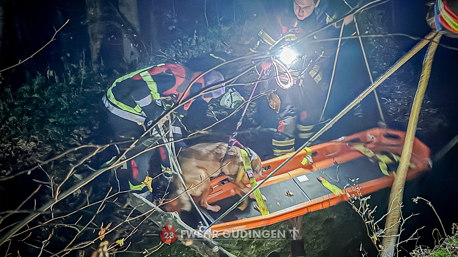 Bei der ersten Untersuchung stellte sich heraus, dass das Tier offenbar keine Verletzungen erlitten hatte. Aufgrund der einsetzenden Dunkelheit musste die Einsatzstelle mit mobilen Beleuchtungsgeräten ausgeleuchtet werden. Zwei Einsatzkräfte stiegen zu dem Hund hinab, um ihn zunächst mithilfe einer Schleifkorbtrage, einer speziellen Trage für Rettungen im unwegsamen Gelände, zu sichern.