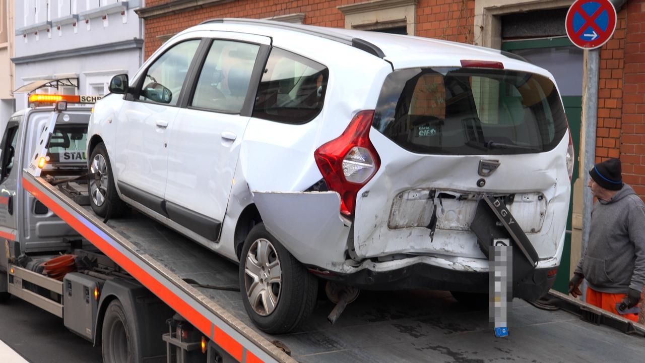 Zunächst muss ein Dacia wegen entgegenkommenden Autos abbremsen. Dies bemerkt der VW-Fahrer zu spät und kracht in den vorausfahrenden Wagen. Der Dacia wird massiv im hinteren Bereich beschädigt.