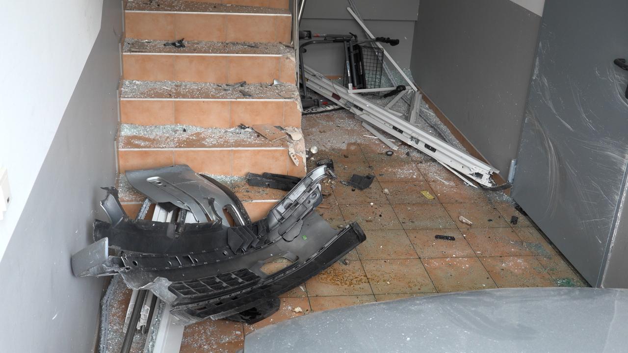 Der VW Golf prallte gegen die Haustür und riss sie aus dem Rahmen. Trümmerteile verteilten sich im Treppenhaus, auch der Briefkasten wurde herausgerissen. Die Rahmenkonstruktion der Türeinfassung sowie Teile der Hausfassade wurden stark beschädigt. Am Pkw entstanden seitlich mehrere Schrammen und Dellen, zudem wurde der Außenspiegel beim Aufprall abgerissen.